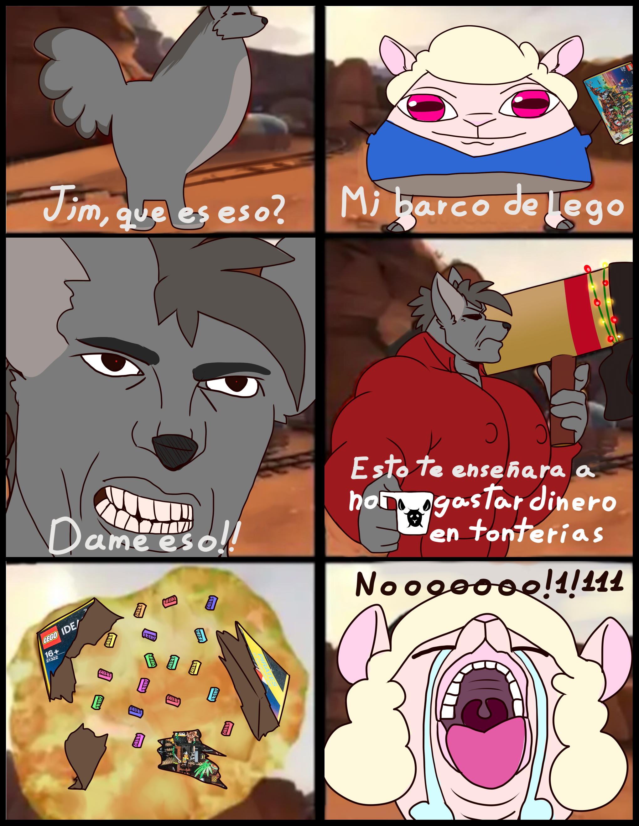 twtr capcom lego resident_evil team_fortress_2 valve albert_wesker jim_the_lamb soldier_(team_fortress_2) wolf_(twtr) avian bird bovid canid canine canis caprine chicken galliform humanoid hybrid mammal phasianid sheep wolf angry anthro big_ears big_tail black_box bodily_fluids box christmas_decorations clenched_teeth container crying cup dialogue duo explosion female festive fluffy fluffy_tail fur grey_body grey_fur hair hooves horizontal_pupils humor lego_brick lego_set male meme_face meme_pose muscular muscular_male nipple_outline open_mouth pink_eyes pupils ranged_weapon red_eyes rocket_launcher screaming serious_face short_hair tail tears teeth text weapon white_body white_fur white_wool wool_(fur) absurd_res comic hi_res meme redraw spanish_text rating:s
