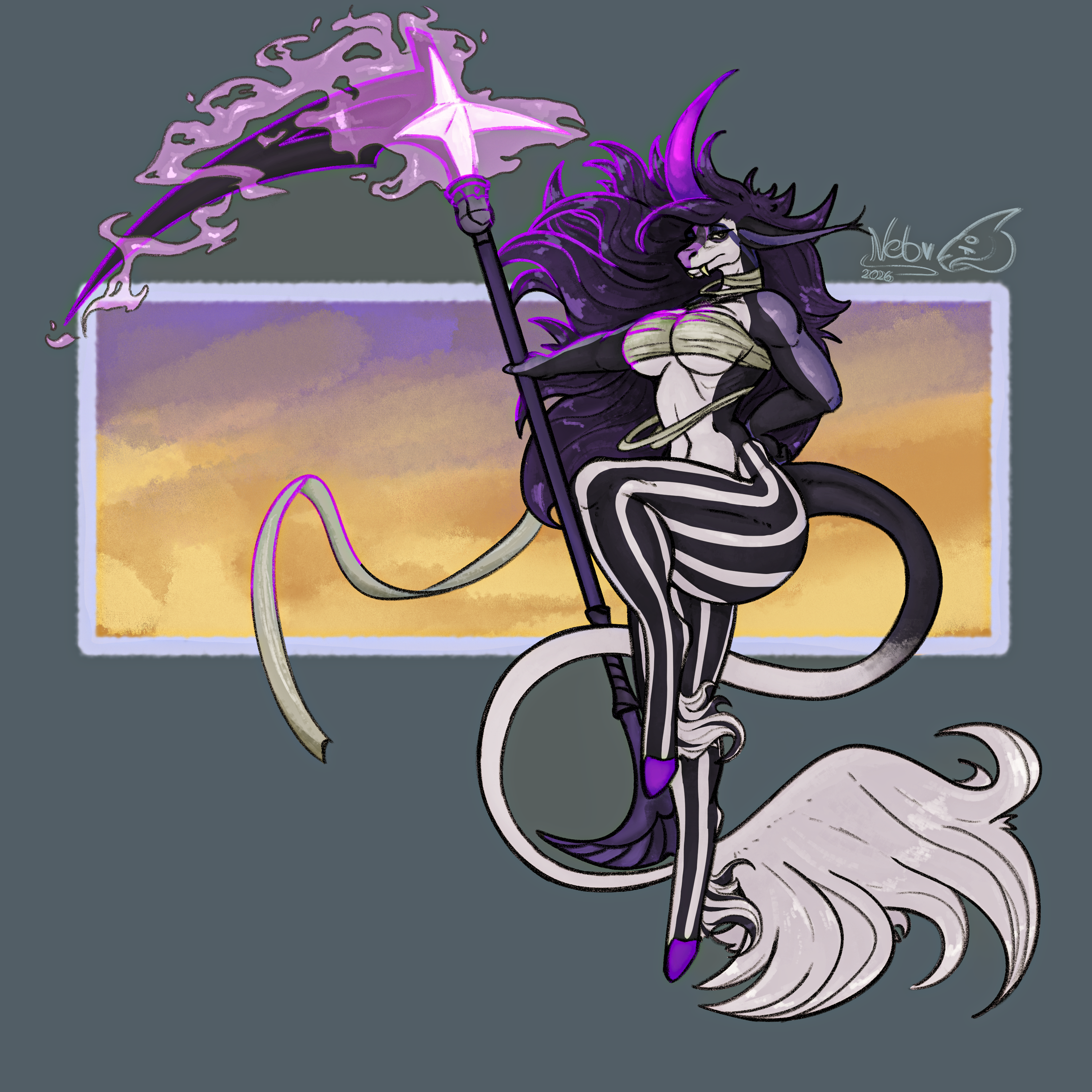nebula_goldenstar equid equine horse mammal anthro clothing female female_anthro fur hair horn long_hair long_tail melee_weapon polearm purple_body purple_fur purple_hair scythe striped_body striped_fur stripes tail thick_thighs undressing weapon absurd_res hi_res rating:s