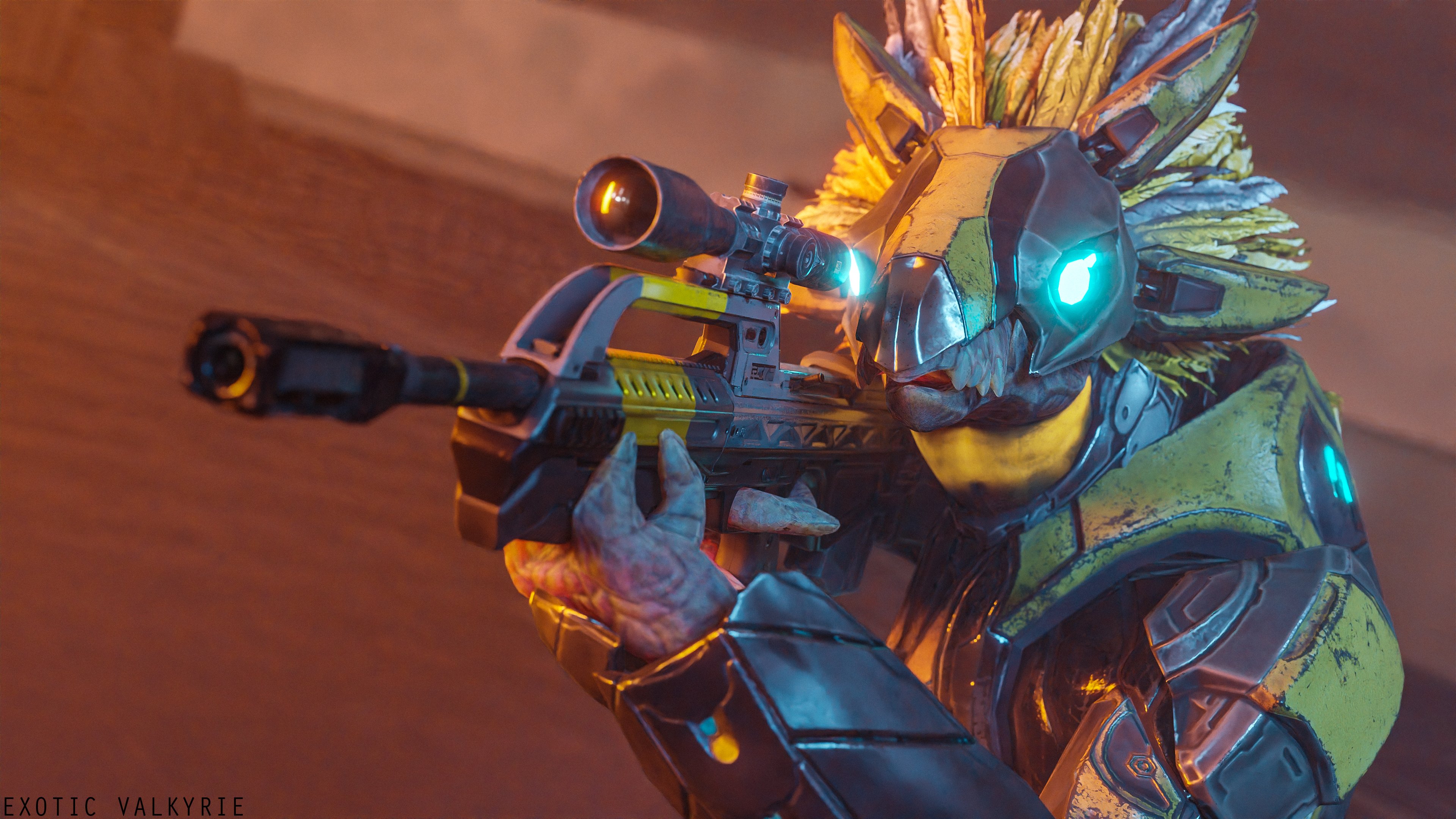exotic_valkyrie halo_(series) microsoft xbox_game_studios alien avian kig-yar scalie t'vaoan aiming aiming_weapon armor avian_caruncle battle_rifle battle_rifle_(halo) blue_eyes face_covered feather_hair feathered_crest feathers female full_armor glowing glowing_eyes grey_body grey_scales gun head_crest headgear helmet pseudo_hair ranged_weapon rifle scales scope sharp_teeth teeth weapon yellow_body yellow_feathers yellow_skin 16:9 3d_(artwork) 4k absurd_res colored digital_media_(artwork) hi_res widescreen rating:s