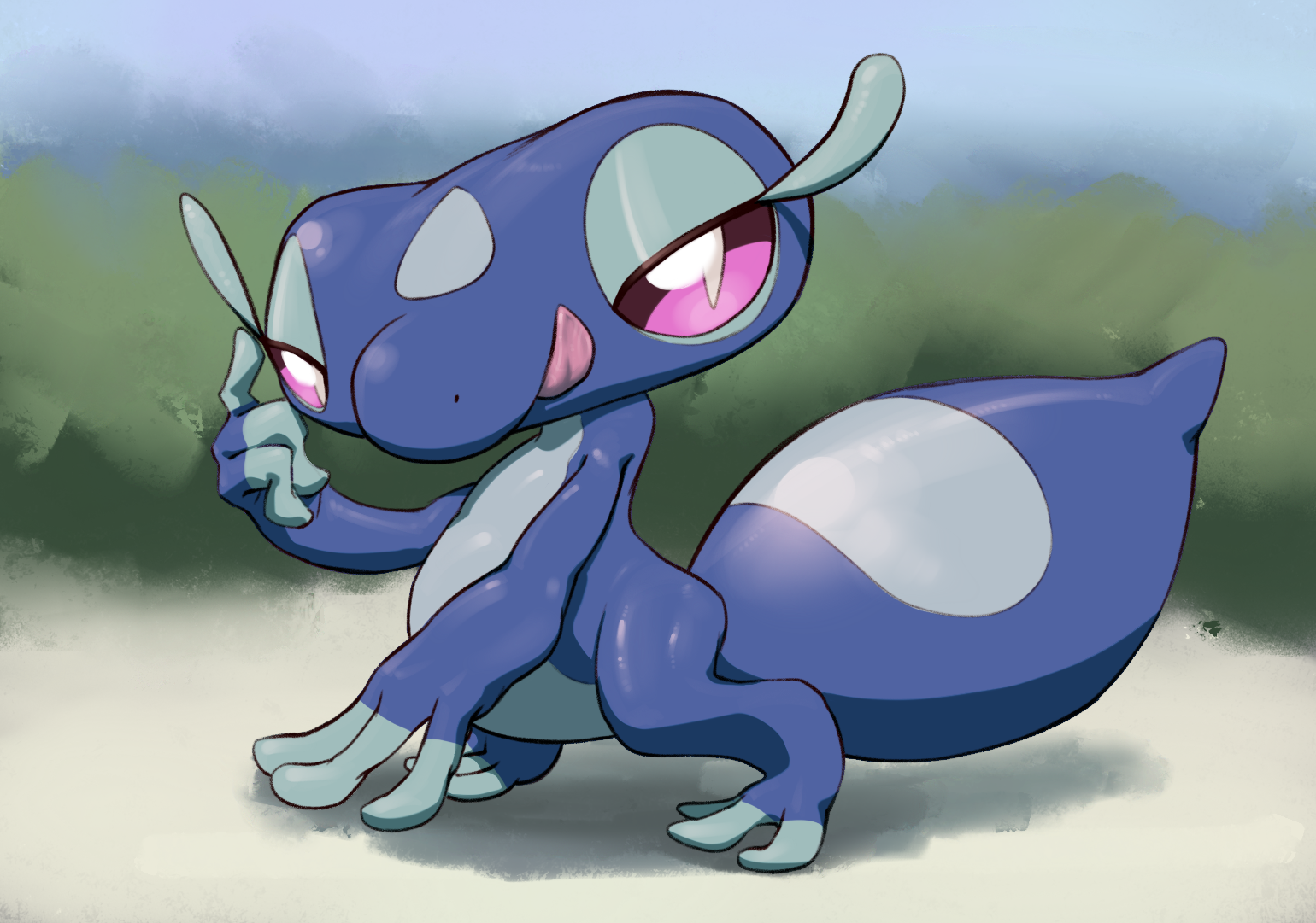 shademattson nintendo pokemon gecko gecqua lizard pokemon_(species) reptile scalie 3_fingers ambiguous_gender feral fingers looking_at_viewer solo standing full-length_portrait portrait rating:s