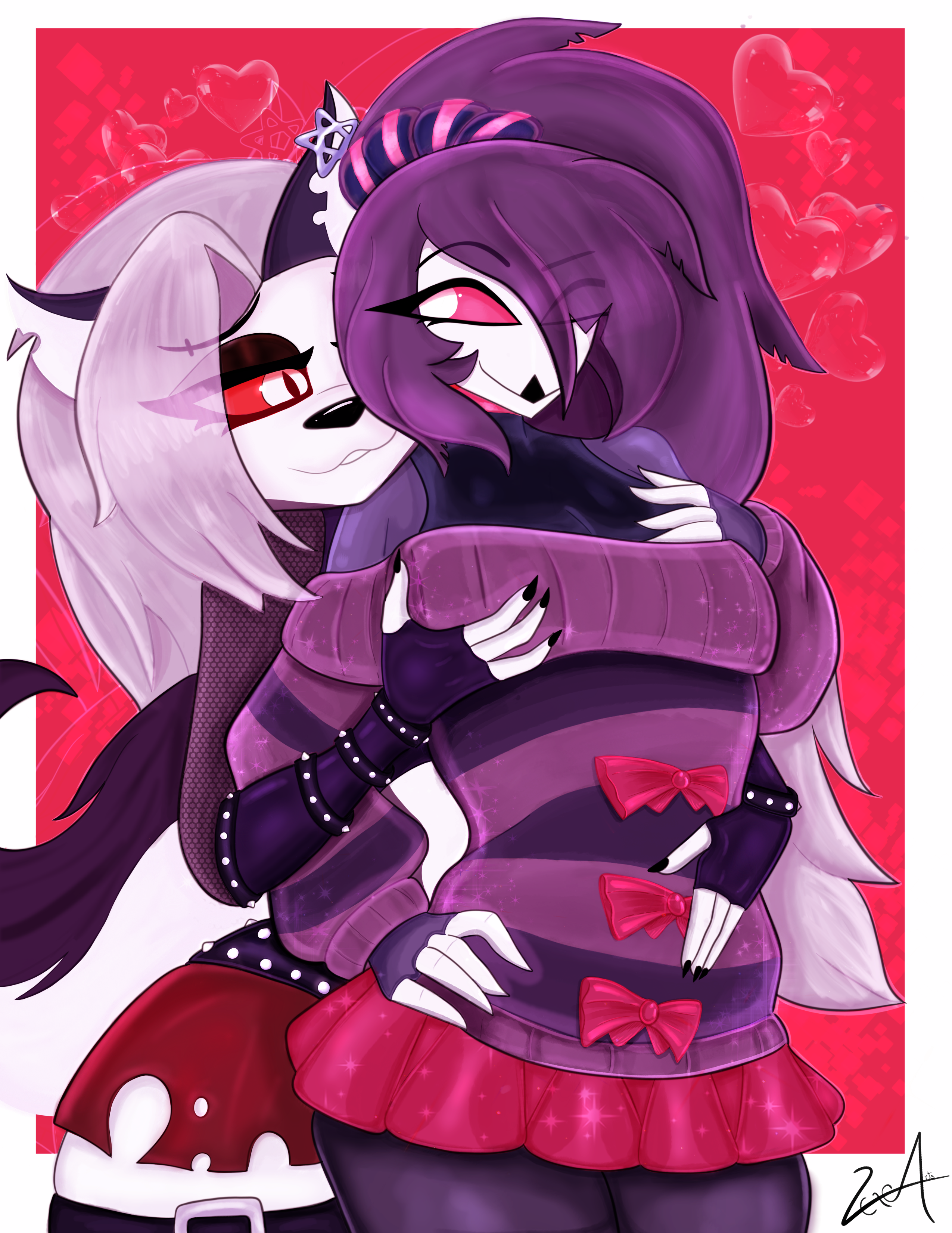 vexter_arts hellaverse helluva_boss mythology valentine's_day loona_(helluva_boss) octavia_(helluva_boss) avian bird canid canid_demon canine demon hellhound mammal mythological_canine mythological_creature owl owl_demon accessory anthro armwear beak clothed clothing duo feathers female female/female fur glistening hair hair_accessory hair_over_eye hand_on_chest hand_on_hip handwear headgear headwear heart_symbol holidays long_hair looking_at_another pink_eyes purple_hair red_sclera simple_background sweater tail topwear white_body white_fur absurd_res digital_media_(artwork) hi_res rating:s
