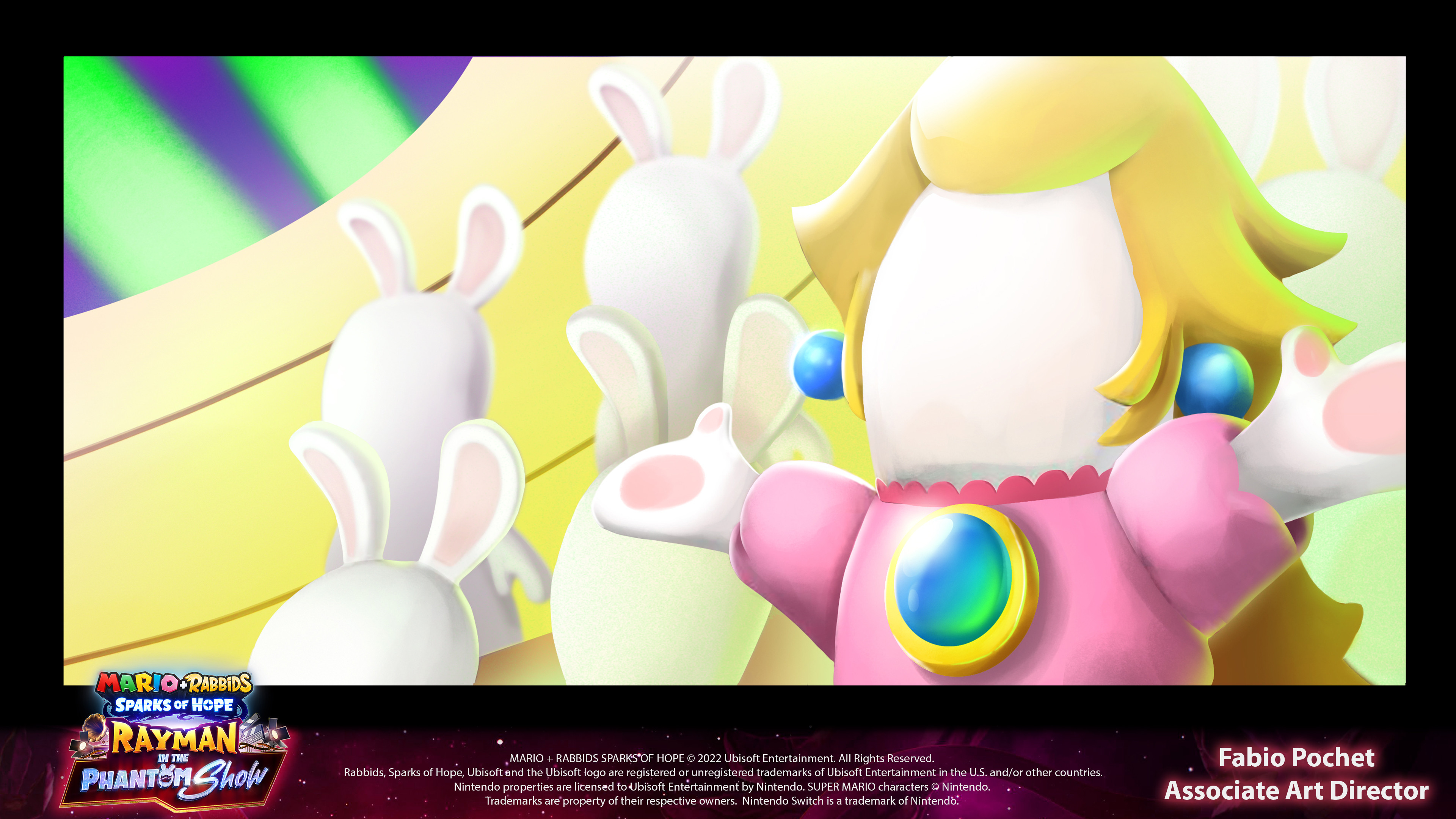 fabio_pochet mario_bros mario_plus_rabbids_kingdom_battle mario_plus_rabbids_sparks_of_hope nintendo raving_rabbids rayman_(series) ubisoft rabbid_peach lagomorph mammal rabbid ambiguous_anthro ambiguous_gender anthro blonde_hair blue_ear_piercing clapperboard clothed clothed_anthro clothed_female clothing ear_piercing featureless_face female female_anthro flat_chested fur gramophone group hair inside light long_ears mitten_hands pawpads performing piercing pink_clothing pink_shirt pink_topwear raised_hands shirt tan_inner_ear tan_pawpads text title topwear white_body white_fur 16:9 2023 4k absurd_res artist_name colored concept_art crossover digital_drawing_(artwork) digital_media_(artwork) english_description english_text hi_res lighting official_art shaded widescreen rating:s