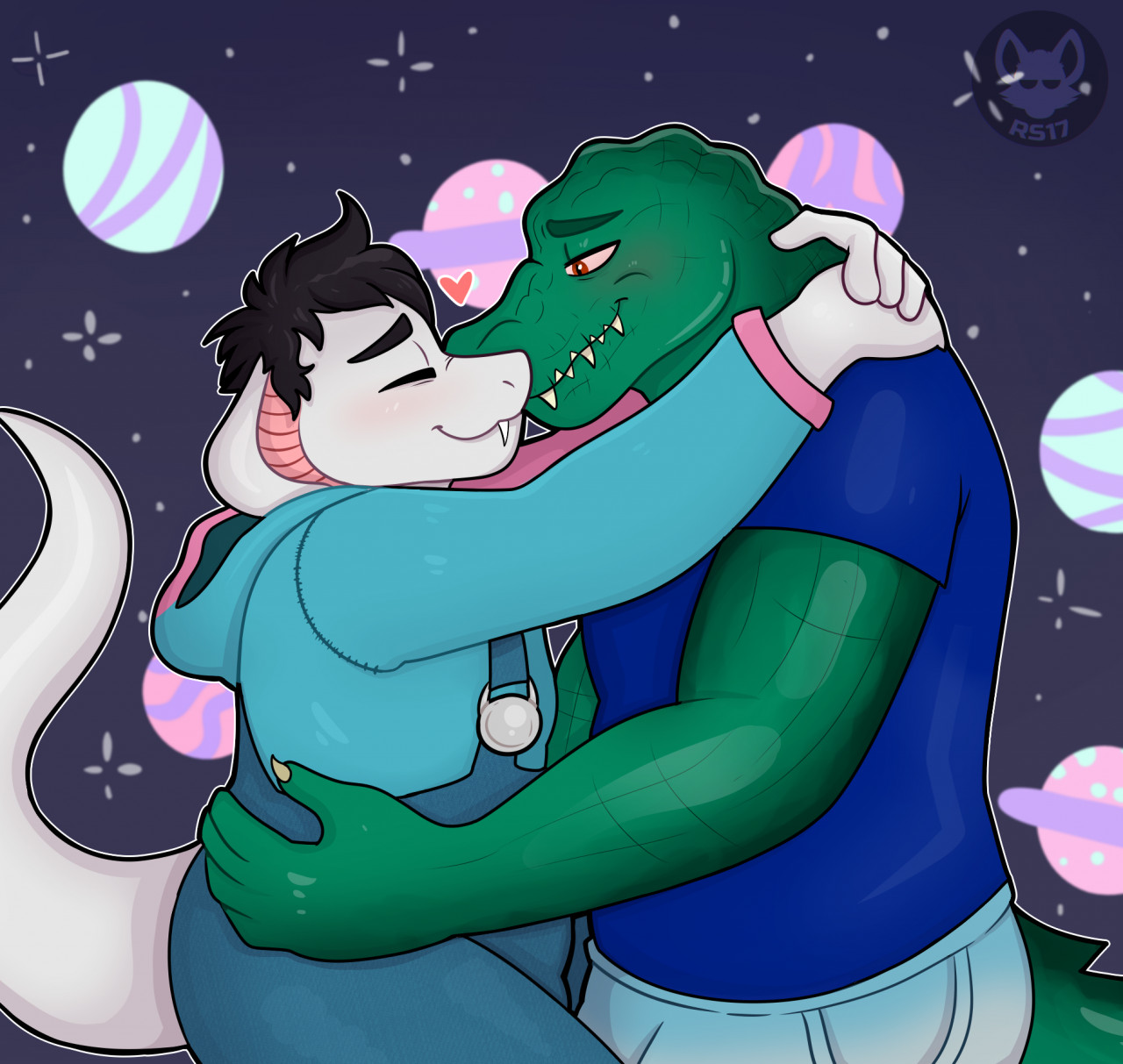 ractoons alligator alligatorid crocodilian reptile scalie snake 4_fingers 5_fingers anthro bent_arm black_eyebrows black_hair blue_bottomwear blue_clothing blue_hoodie blue_overalls blue_shirt blue_t-shirt blue_topwear blush bottomwear claws clothed clothed_anthro clothed_male clothing duo eyebrows eyes_closed finger_claws fingers fully_clothed fully_clothed_anthro fully_clothed_male green_body green_eyebrows green_scales green_tail grey_body grey_skin grey_tail hair heart_symbol hoodie hugging_partner interspecies kiss_on_lips kissing larger_anthro larger_male light logo long_tail looking_at_another looking_at_partner love macro male male/male outline overalls pink_sclera planet pockets red_eyes scales seam_(sewing) sharp_teeth shirt short_hair size_difference smaller_anthro smaller_male smile smiling_at_another smiling_at_each_other snake_hood space star t-shirt tail tan_claws teeth terra_macro topwear white_outline 2020 artist_logo colored digital_drawing_(artwork) digital_media_(artwork) english_description hi_res lighting shaded spanish_description rating:s