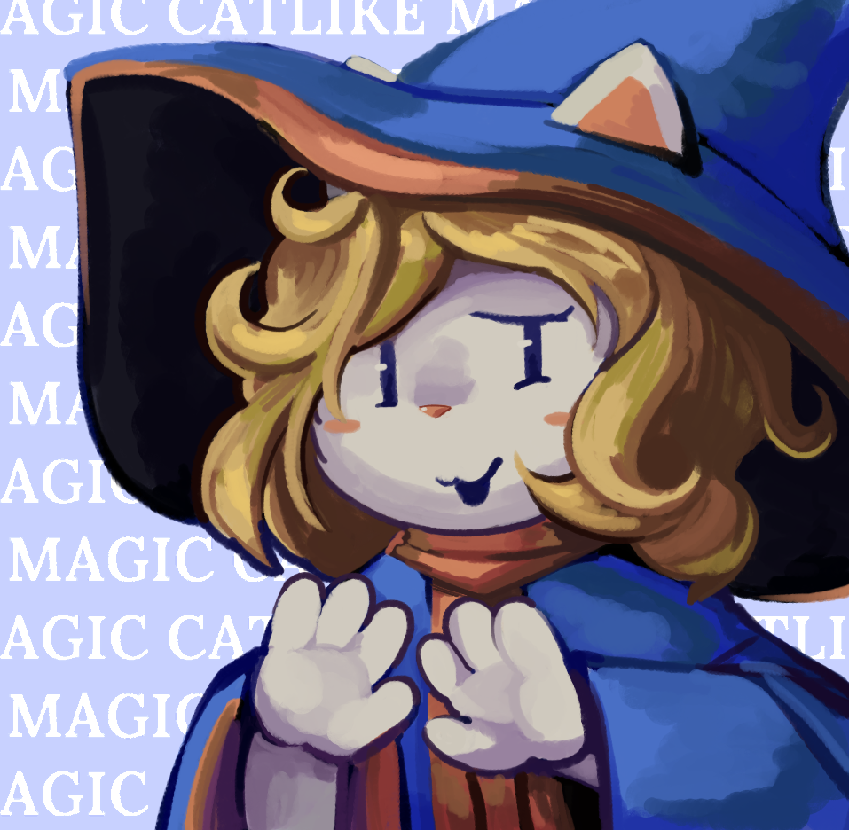 scrambledeve catlike_magic marni_(catlike_magic) domestic_cat felid feline felis mammal anthro blonde_hair blush clothed clothing female fur hair mage_hat mage_robe magic_user open_mouth simple_background solo text white_body white_fur rating:s