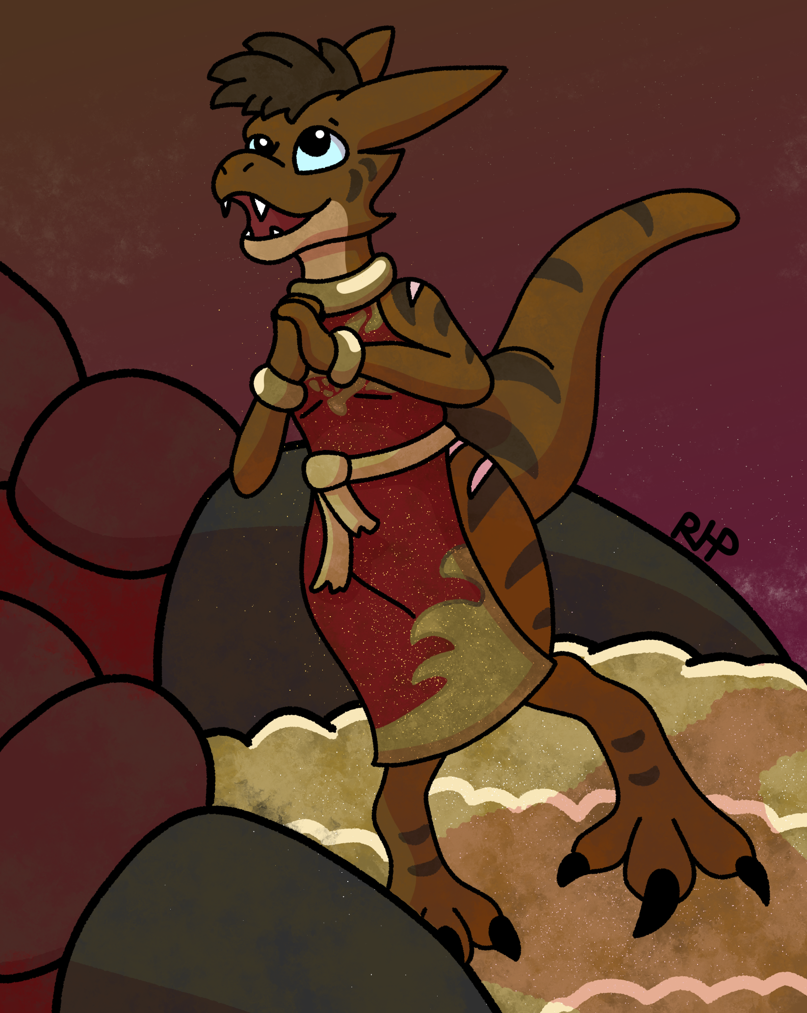 rhp mythology dragon kobold mythological_creature mythological_scalie scalie 3_toes ambiguous_gender anthro big_tail brown_body claws clothed clothed_anthro clothed_male clothing digitigrade dress duo feet femboy front_view fully_clothed long_tail male red_body red_clothing red_dress red_scales scales size_difference solo_focus tail tapering_tail thick_tail toes treasure_hoard digital_drawing_(artwork) digital_media_(artwork) hi_res rating:s