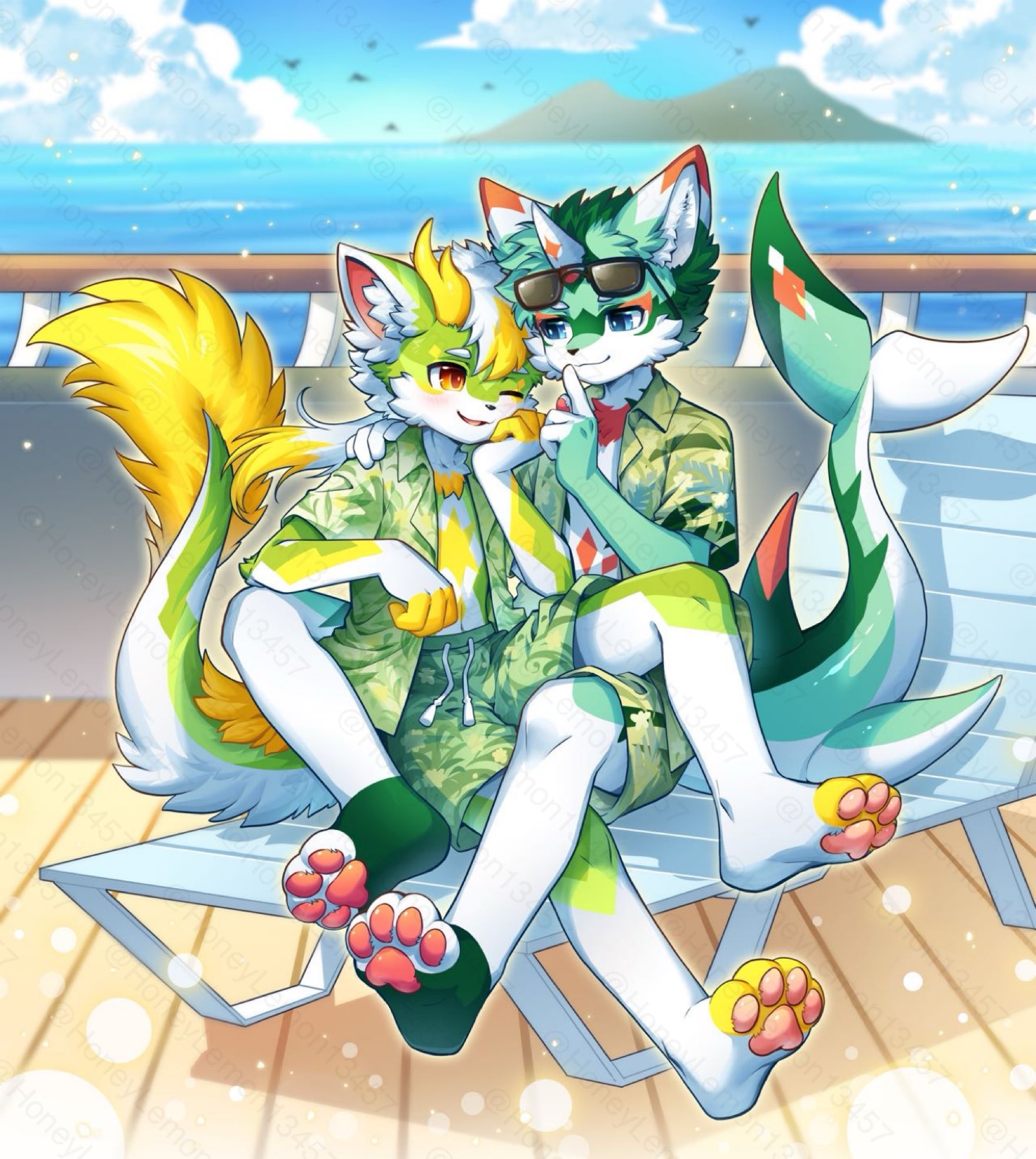 honeylemon13457 mythology honlem lai_ka aquatic avian bird dragon fish furred_dragon furred_fish furred_scalie mythological_creature mythological_scalie scalie 1_horn 2_horns 4_fingers 4_toes anthro bench blue_eyes boat bottomwear clothed clothing cuddling day dragon_horn dragon_tail duo eye_contact eyewear eyewear_on_head feet fingers fish_tail footwear fur green_body green_bottomwear green_clothing green_fur green_jacket green_shorts green_topwear horn inner_ear_fluff jacket kemono leaf_pattern looking_at_another male multicolored_body multicolored_fur on_bench on_boat open_clothing open_jacket open_mouth open_smile open_topwear outside pattern_bottomwear pattern_clothing pattern_jacket pattern_shorts pattern_topwear romantic romantic_ambiance sea shorts shush sitting sitting_on_another smile socks sunglasses sunglasses_on_head toes topwear tuft vehicle water watercraft wearing_sunglasses white_body white_fur yellow_body yellow_eyes yellow_fur 2025 cel_shading digital_drawing_(artwork) digital_media_(artwork) distracting_watermark hi_res shaded watermark rating:s
