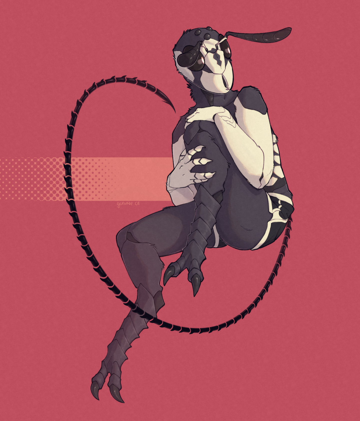 gunwasp arthropod bald-faced_hornet hymenopteran insect vespid wasp yellowjacket_(wasp) 2_toes ambiguous_gender antennae_(anatomy) anthro athletic_wear bent_leg black_body black_exoskeleton bottomwear claws clothed clothing compound_eyes digitigrade exoskeleton feet finger_claws gym_bottomwear gym_shorts hand_on_knee hand_on_leg mandibles ocellis red_background segmented_body segmented_tail shorts simple_background sitting solo tail toes topless topless_anthro white_body white_exoskeleton 2026 digital_drawing_(artwork) digital_media_(artwork) full-length_portrait hi_res portrait shaded rating:s