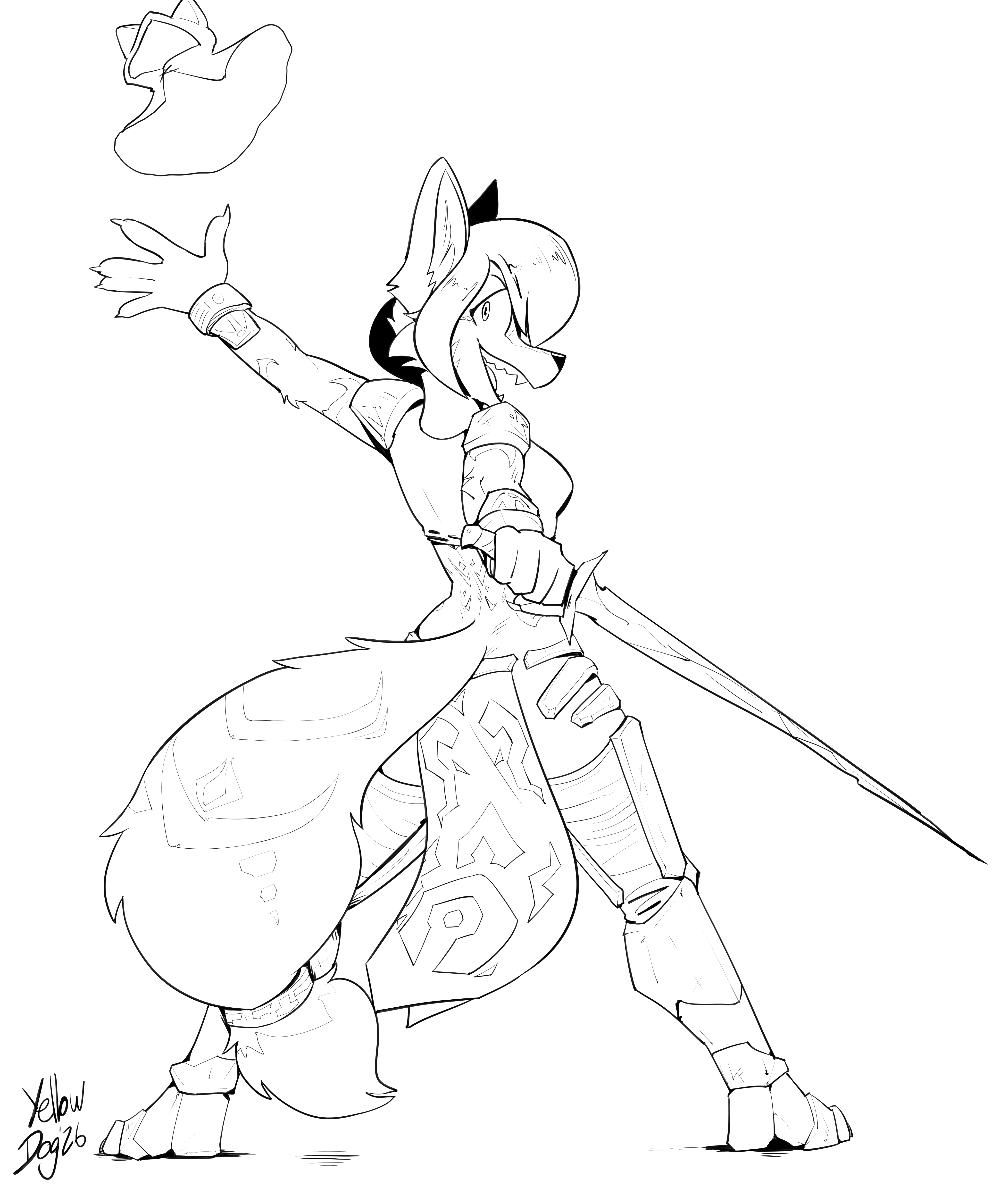 yellowdog canid canine fox mammal anthro armor biped bottomwear bracelet clothing cuisse female female_anthro greaves holding_melee_weapon holding_object holding_sword holding_weapon jewelry loincloth looking_at_viewer looking_back looking_back_at_viewer melee_weapon open_mouth open_smile sabatons smile solo sword unconvincing_armor weapon 2026 absurd_res digital_media_(artwork) hi_res rating:s