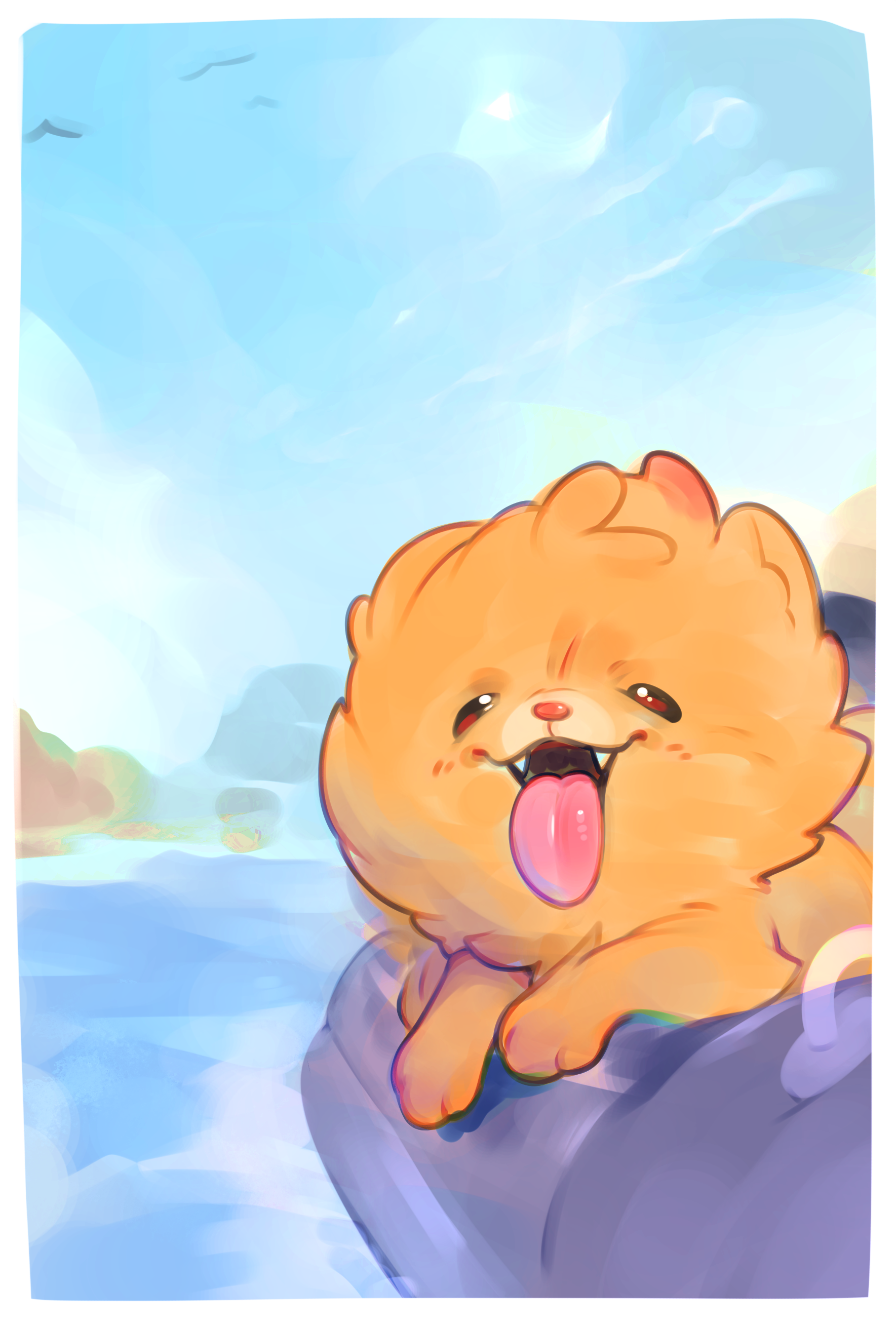 ligma_(artist) nintendo pokemon pokemon_winds_and_waves ambient_bird generation_10_pokemon pokemon_(species) pombon ambiguous_feral ambiguous_gender border cute_fangs detailed_background fangs feral fur glistening glistening_eyes inflatable inner_tube multicolored_body open_mouth open_smile orange_body orange_fur outside paws pink_tongue red_nose smile solo teeth tongue tongue_out water white_border 2026 absurd_res digital_media_(artwork) hi_res portrait shaded three-quarter_portrait rating:s