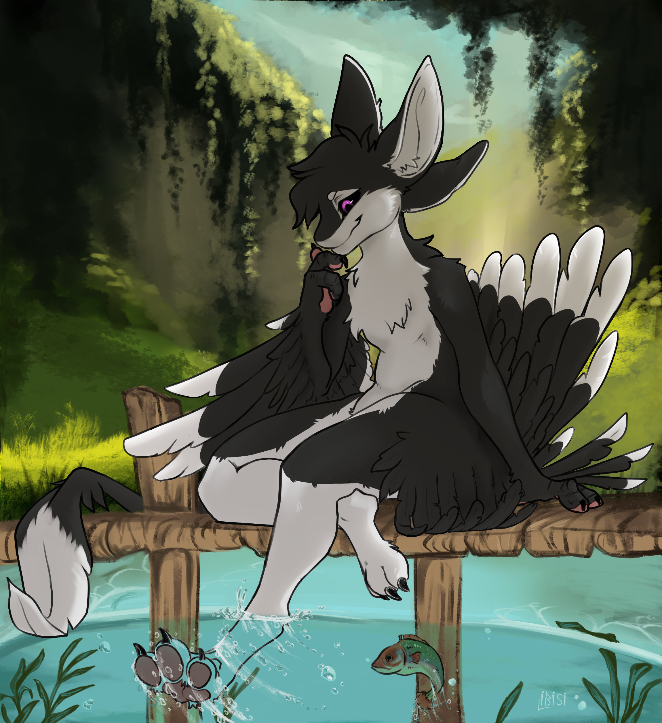 ibisi fyr_(fenrir784) ambient_fish ambient_sealife avali avian bird 3_fingers 3_toes 4_ears amazing_background ambiguous_gender anthro biped black_body black_claws black_feathers black_finger_claws black_fur black_hair black_hands black_sclera black_tail black_toe_claws black_wings bridge chest_tuft claws closed_smile cloud countershade_face countershade_fur countershade_torso countershading day detailed_background digitigrade feathered_wings feathers feet feral finger_claws finger_on_chin fingers foot_focus forest fur grass hair inner_ear_fluff light light_beam long_tail looking_down mouth_closed multi_ear multicolored_body multicolored_feathers multicolored_fur multicolored_tail nature nature_background nude nude_anthro outside partially_submerged pawpads paws pink_pawpads plant purple_eyes seaweed sitting sky smile solo splashing_water spread_toes sunbeam sunlight tail tail_feathers tail_tuft text toe_claws toes tree tuft tufted_fur underwater_view water white_body white_countershading white_feathers white_feet white_fur white_inner_ear white_tail winged_arms wings 2026 absurd_res artist_name colored detailed digital_drawing_(artwork) digital_media_(artwork) english_text hi_res shaded signature simple_shading rating:s