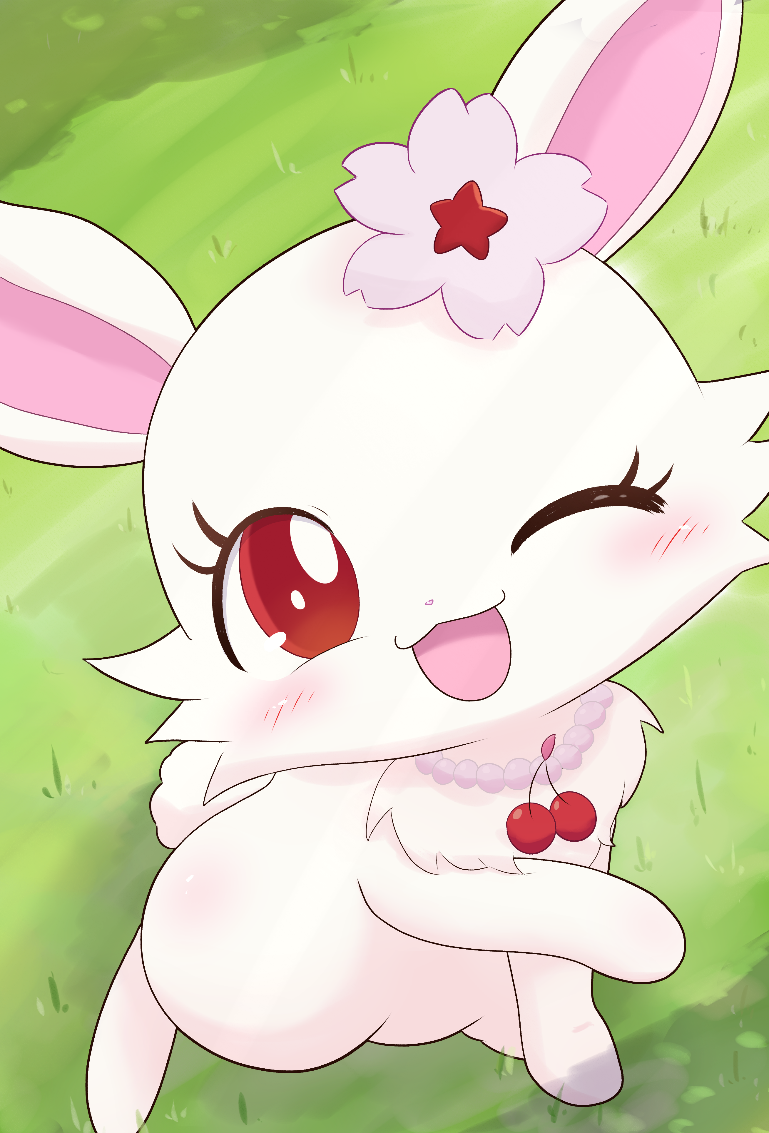bluehiyokobunny jewelpet sanrio sega_fave ruby_(jewelpet) lagomorph leporid mammal rabbit accessory anthro blush female female_anthro flower flower_in_hair fur grass hair hair_accessory looking_at_viewer looking_up looking_up_at_viewer one_eye_closed plant red_eyes white_body white_fur wink absurd_res hi_res rating:s