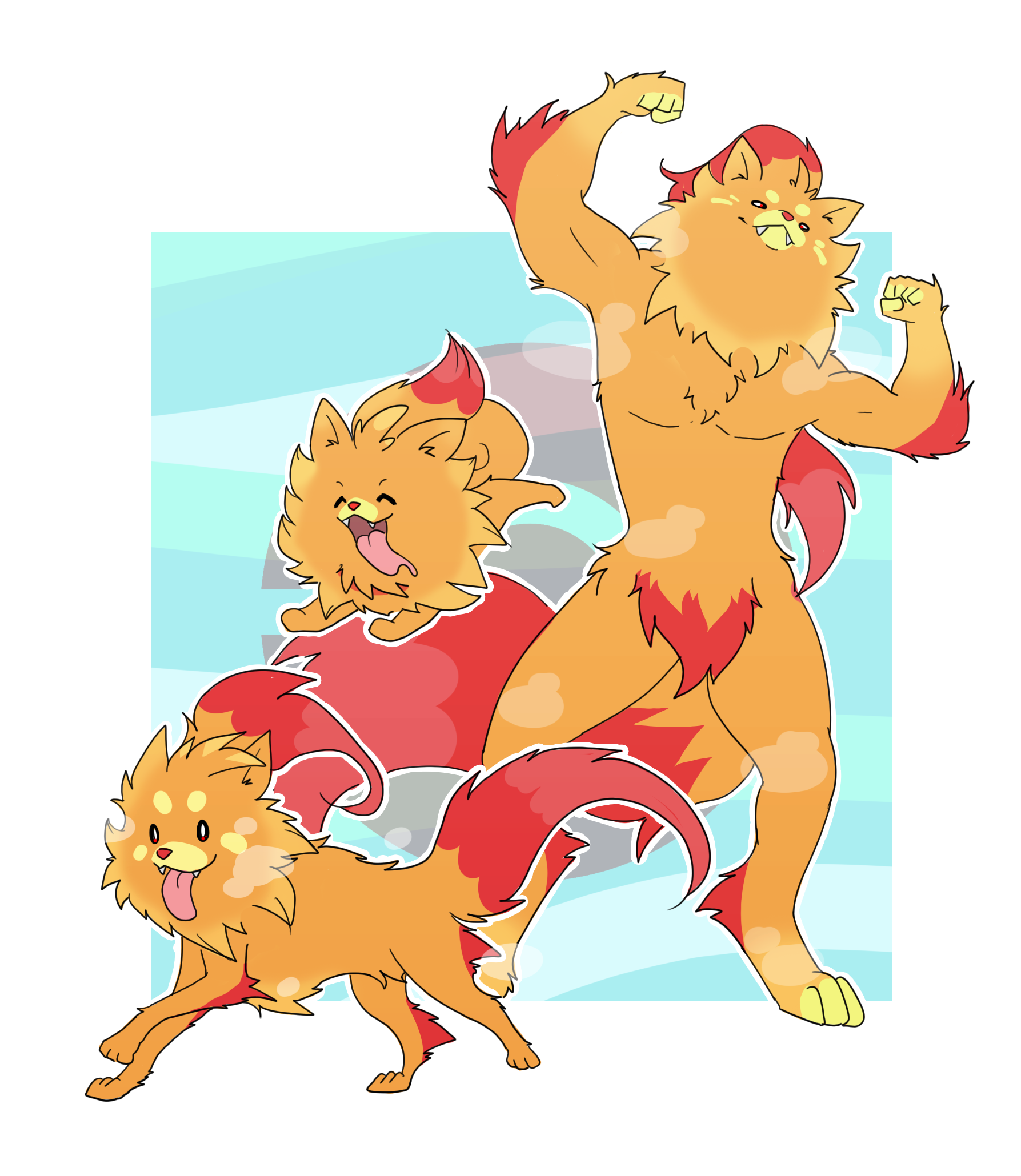 ariesartist fakemon game_freak nintendo pokemon pokemon_winds_and_waves canid canine generation_10_pokemon mammal pokemon_(species) pombon ambiguous_gender anthro evolution fire muscular muscular_anthro hi_res rating:s