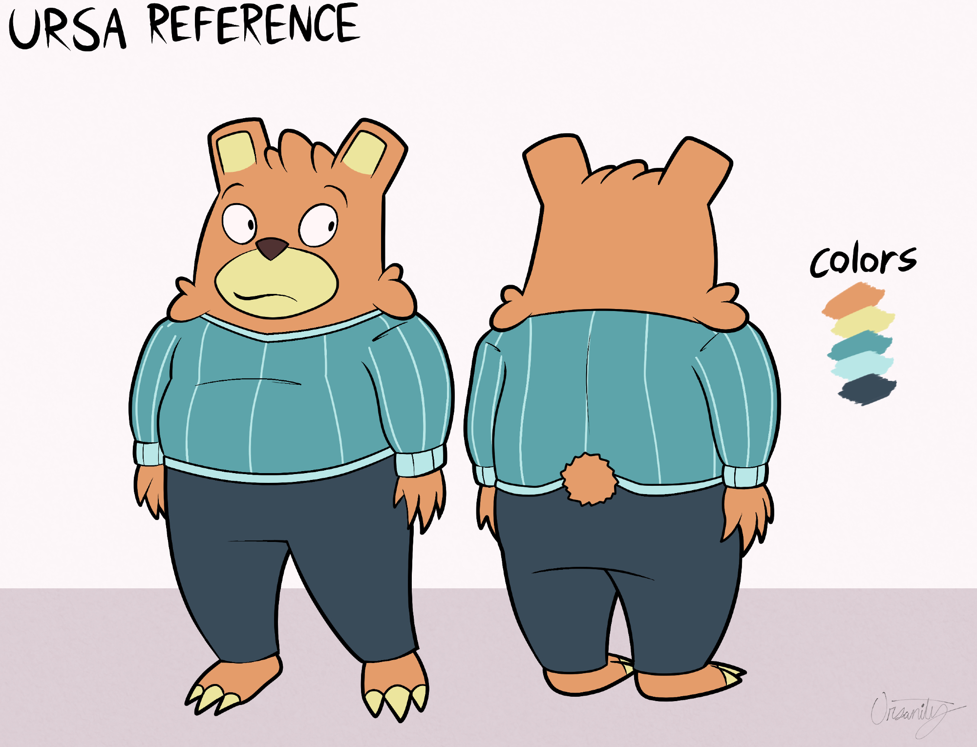 ursanity ursa_(ursanity) bear mammal allcaps anthro barefoot black_text blue_bottomwear blue_clothing blue_pants bottomwear brown_nose claws clothing color_swatch detailed_background feet fur green_clothing green_shirt green_topwear male orange_body orange_fur pants shirt solo tan_body tan_fur text topwear english_text hi_res rating:s