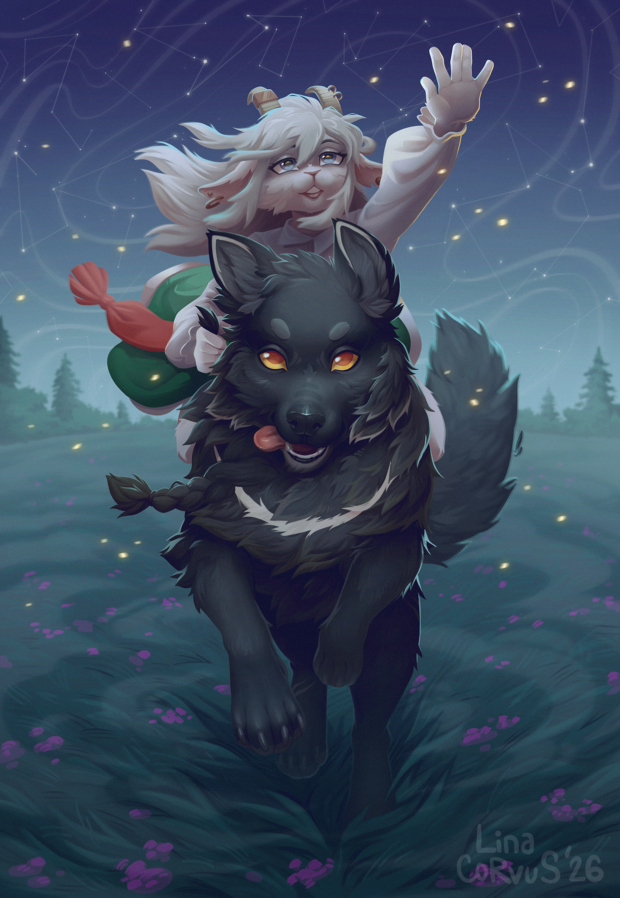 lina_corvus bovid canid canine canis caprine goat mammal wolf ambiguous_gender anthro biped claws clothed clothed_anthro clothed_female clothing duo feet female feral fingers front_view fur hair horn night outside plant sky smile star tail teeth toes tongue tree 2026 digital_drawing_(artwork) digital_media_(artwork) hi_res rating:s