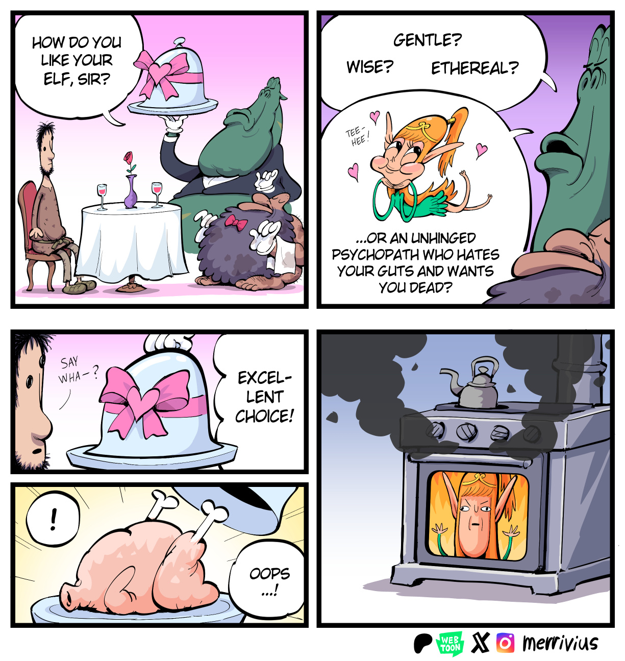merrivius elf_comic dwarf_(merrivius) elf_(merrivius) human_(merrivius) orc_(merrivius) dwarf elf human mammal orc alcohol appliance bald beard beverage big_nose black_beard black_facial_hair black_hair blush blush_stickers bow_tie chicken_meat clothing container crown cup dialogue dinner dinner_table dress drinking_glass eyebrows eyelashes facial_hair female food glass glass_container glass_cup green_body green_clothing green_dress green_ears green_skin group hair headgear heart_symbol humanoid_pointy_ears humor kitchen_appliance light_body light_skin long_hair male meat misunderstanding orange_hair oven pink_bow_tie pointy_ears ponytail purple_beard purple_facial_hair short_hair simple_eyes smoke tan_body tan_skin text tiara wine wine_glass comic english_text hi_res rating:s