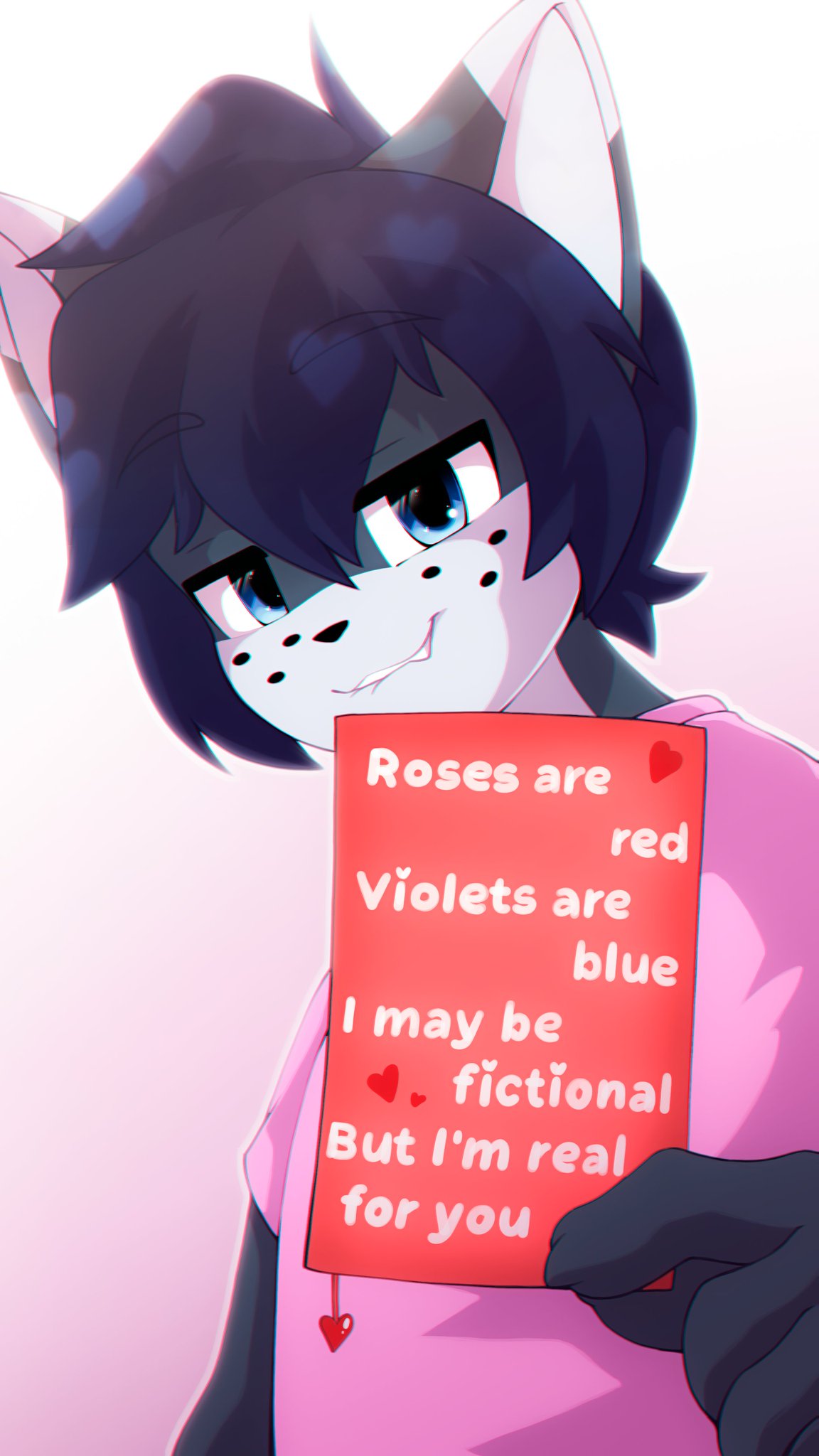 eipril valentine's_day rouen_(eipril) domestic_cat felid feline felis mammal anthro bite biting_lip clothed clothing cute_fangs daww fangs hair heart_symbol holding_card holding_object holidays male roses_are_red self_bite shirt solo t-shirt teeth text topwear valentine's_day_card 2026 hi_res rating:s