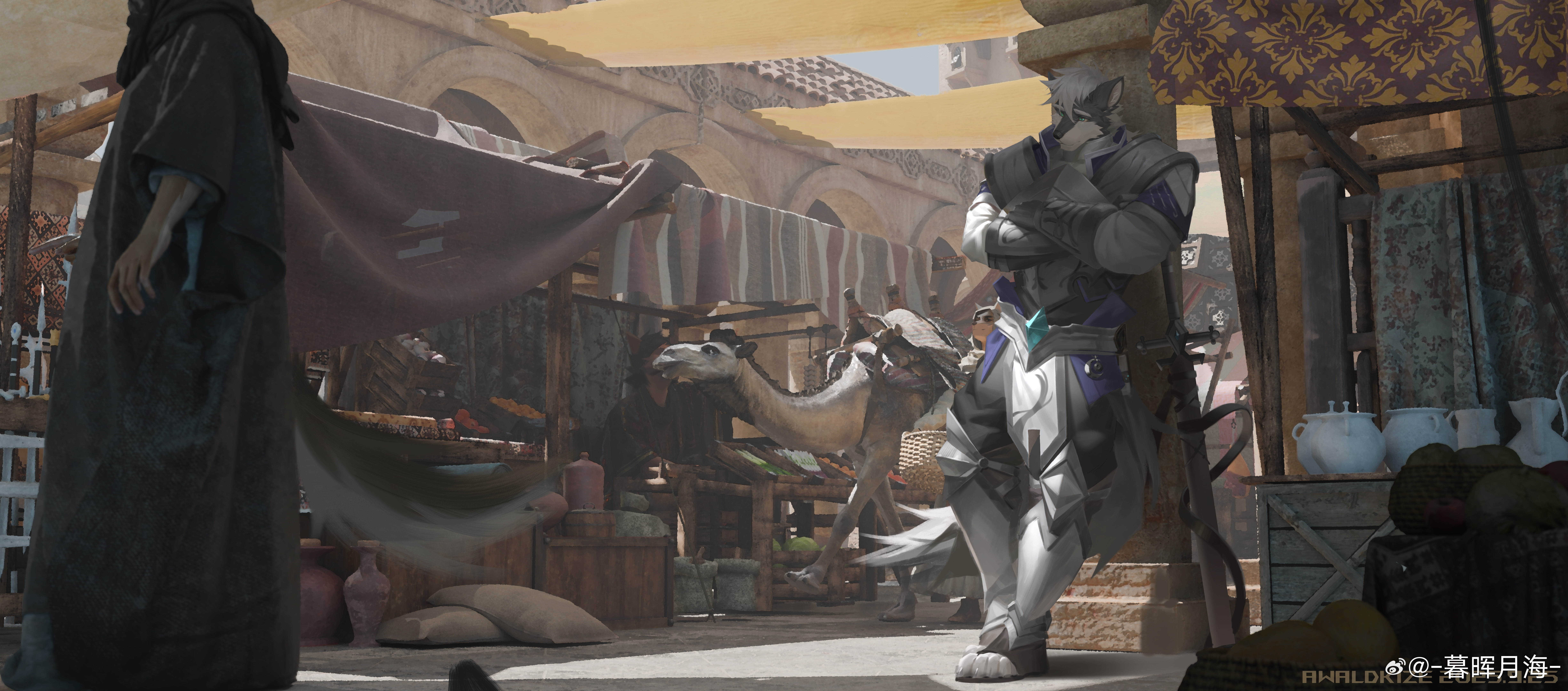 awaldkize ambiguous_species camel camelid canid canine mammal anthro armor clothed clothing crossed_arms day front_view fur grey_body grey_fur group hair male male_anthro market mouth_closed outside short_hair side_view standing teal_eyes white_body white_fur white_hair absurd_res hi_res rating:s
