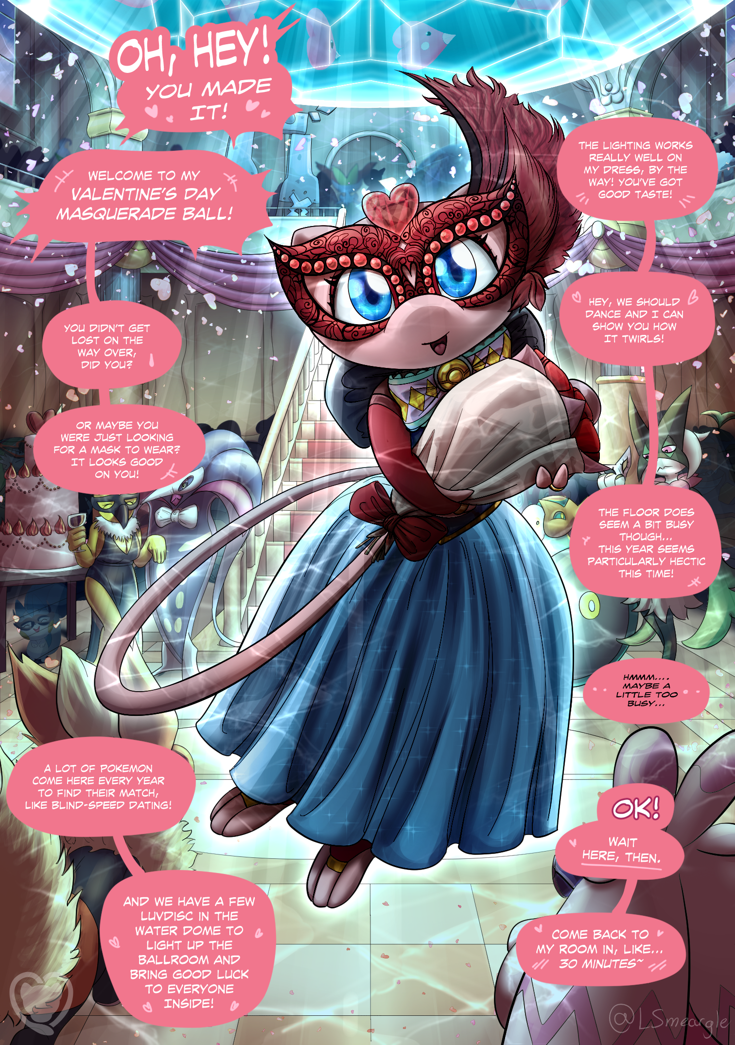 smeargle20 nintendo pokemon pokemon_unite valentine's_day fashionable_style_mew aquatic bellibolt eeveelution fish flareon generation_1_pokemon generation_3_pokemon generation_6_pokemon generation_8_pokemon generation_9_pokemon hypno_(pokemon) legendary_pokemon luvdisc malamar mammal meowscarada mew_(pokemon) pokemon_(species) stonjourner tinkaton ambiguous_gender ballroom barefoot blue_clothing bouquet bow_tie breasts cake candy cherry_blossom chocolate chocolate_fountain cleavage clothed clothing container dessert dialogue dress eyewear feet female feral first_person_view flower flower_bouquet food fountain fur furniture glass glass_container glass_dome glasses gold_ring green_body group heart_symbol holidays holowear_(pokemon) looking_at_viewer marble mask masquerade_mask multicolored_body open_mouth plant prunus_(flower) rock rose_(flower) smile solo speech_bubble stairs tail text water yellow_body digital_media_(artwork) english_text hi_res rating:s