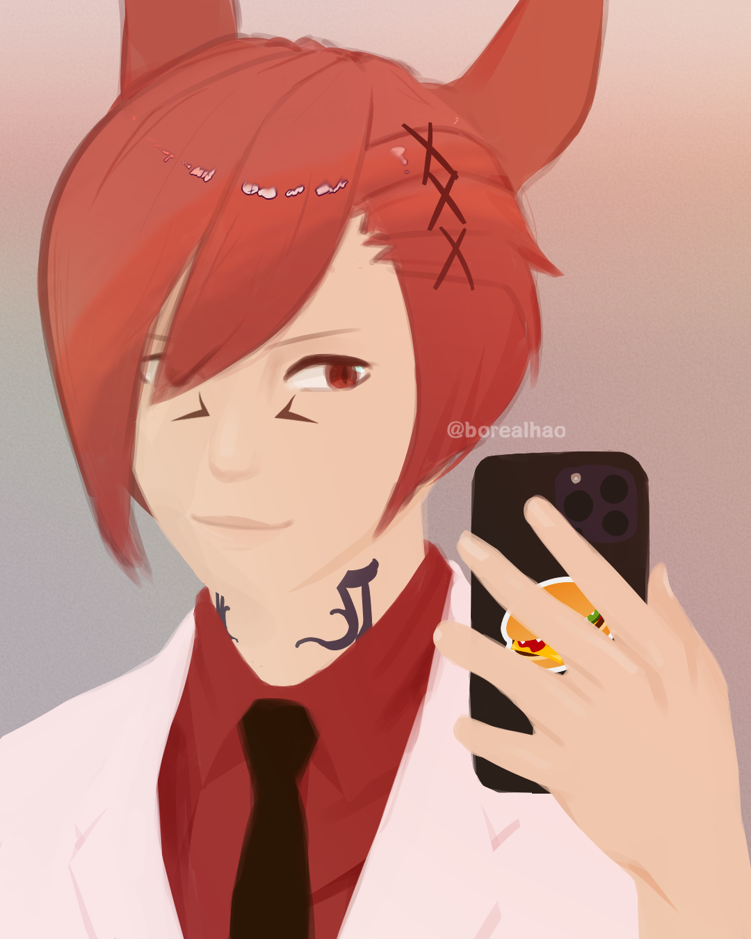 borealhao conditional_dnp final_fantasy final_fantasy_xiv final_fantasy_xiv:_a_realm_reborn square_enix g'raha_tia animal_humanoid cat_humanoid felid felid_humanoid feline feline_humanoid humanoid mammal mammal_humanoid miqo'te bangs black_necktie cellphone clothing electronics facial_markings formal_clothing hair head_markings jacket long_bangs looking_at_object looking_at_phone looking_at_viewer male markings mirror_selfie neck_tattoo necktie phone red_clothing red_eyes red_hair red_shirt red_topwear selfie shirt side_swept_bangs simple_background smartphone smile smirk solo topwear upper_body white_clothing white_jacket white_topwear 2023 hi_res portrait watermark rating:s