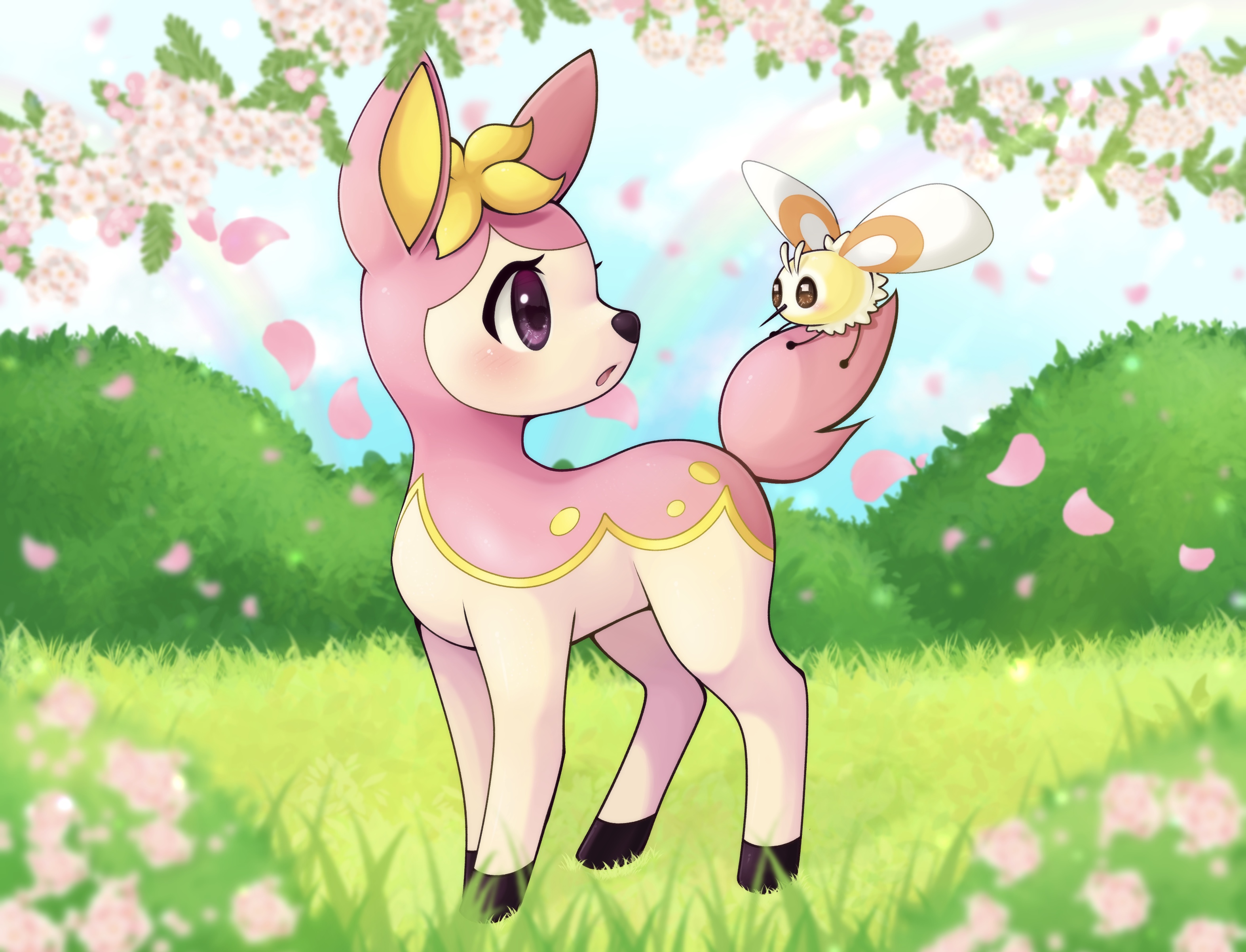 dietranch nintendo pokemon celebi chikorita elemental_creature flora_fauna generation_2_pokemon humanoid legendary_pokemon pokemon_(species) ambiguous_gender antennae_(anatomy) blue_eyes cloud duo feral flower grass green_body insect_wings moss open_mouth plant red_eyes sky wings 2026 hi_res signature rating:s