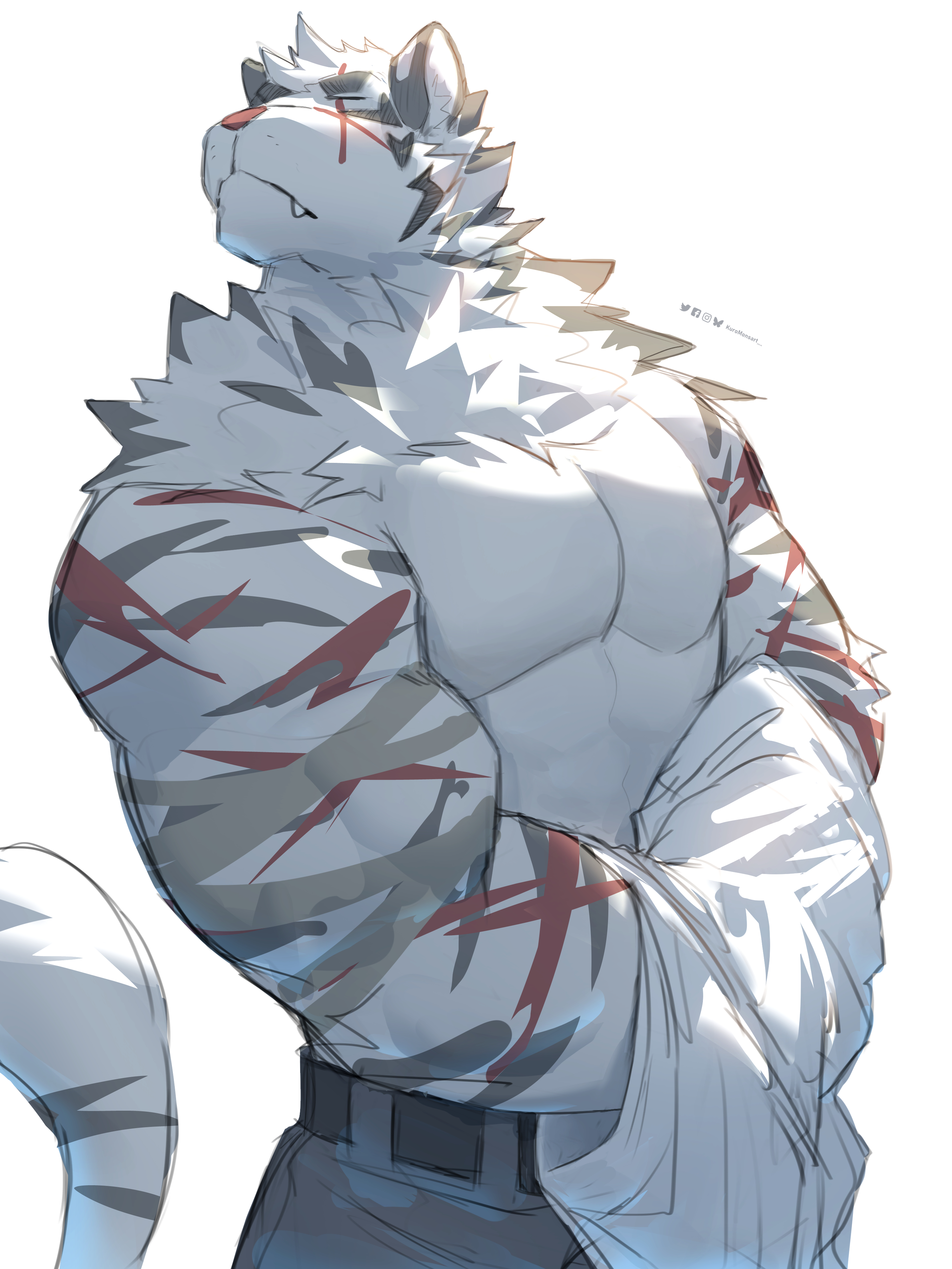 kuromonsart bluesky_(social_media) facebook instagram twitter felid mammal anthro belt biceps big_muscles biped blue_bottomwear blue_clothing bluesky_logo bottomwear clothed clothed_anthro clothed_male clothing eyes_closed facebook_logo front_view fur grey_body grey_fur grey_stripes hair head_turned holding_clothing holding_object holding_shirt holding_topwear huge_muscles inner_ear_fluff instagram_logo male markings monotone_clothing monotone_shirt monotone_topwear mouth_closed muscular muscular_anthro muscular_male neck_tuft pecs red_stripes shirt simple_background snout solo striped_arms striped_markings striped_tail stripes tail tail_markings text topless topless_anthro topless_male topwear tuft twitter_logo underbite white_background white_body white_clothing white_fur white_hair white_inner_ear white_inner_ear_fluff white_shirt white_topwear 2024 3:4 absurd_res artist_name dated digital_drawing_(artwork) digital_media_(artwork) english_text half-length_portrait hi_res portrait rating:s