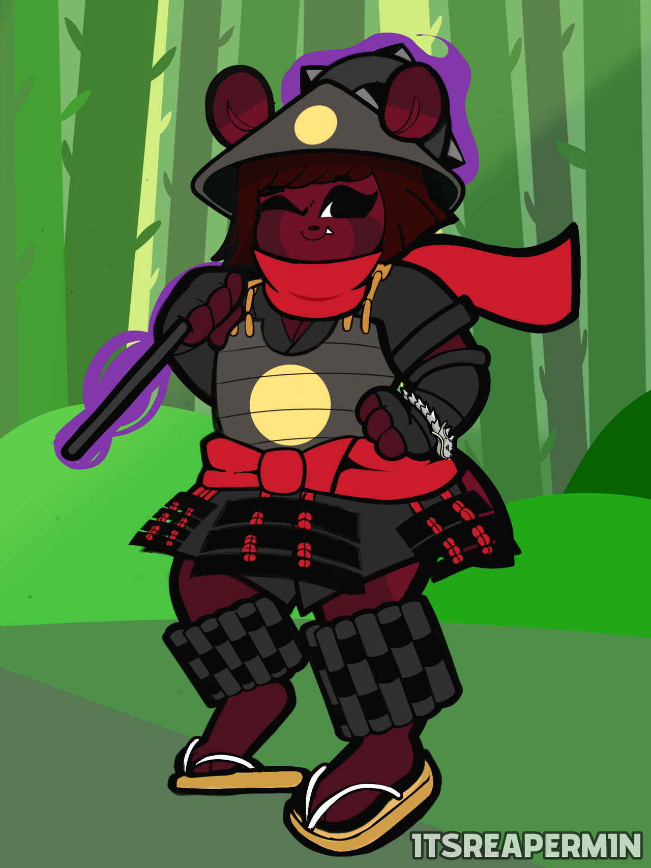 itsreapermin canid canine canis mammal raccoon_dog tanuki anthro armor bottomwear breasts brown_body brown_fur clothed clothing female fur hair headgear helmet holding_object holding_weapon looking_at_viewer melee_weapon mochi_(gecko_boi) scarf simple_background smile solo standing tail teeth thick_thighs weapon weapon_on_shoulder digital_media_(artwork) hi_res rating:s