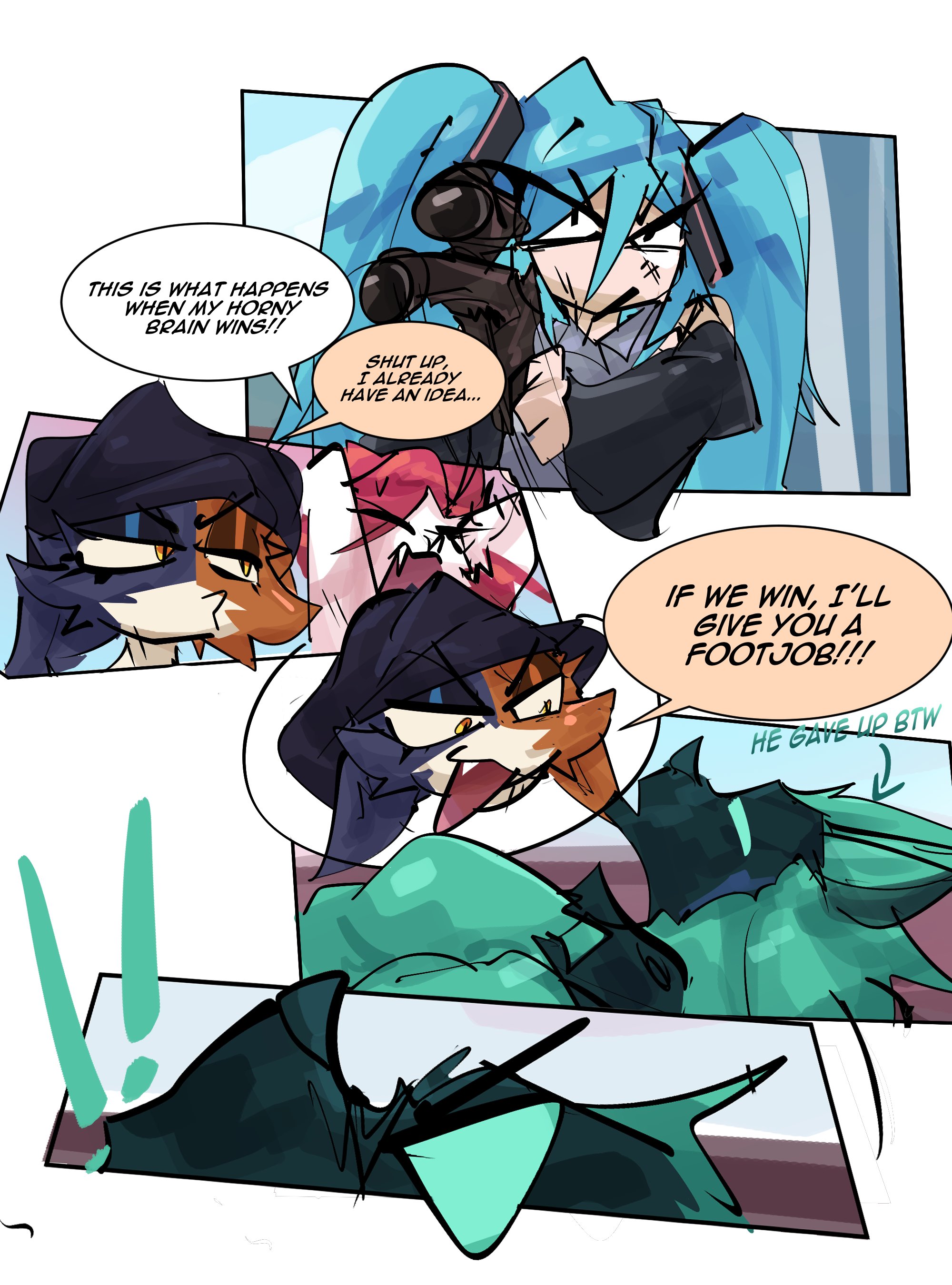 sirkerner epic_games fortnite mythology vocaloid cerberus_(fortnite) hatsune_miku kimiko_five-tails meow_skulls calico_cat canid canid_demon canine demon domestic_cat felid feline felis fox hellhound human mammal mythological_canine mythological_creature anthro beanie black_beanie black_clothing black_hat black_headwear blue_body blue_fur blue_hair brown_body brown_fur cheek_tuft clothing dialogue exclamation_point eyes_closed facial_tuft female fur fur_tuft green_body green_fur group gun hair hat headgear headwear holding_gun holding_object holding_ranged_weapon holding_weapon lidded_eyes male multicolored_body multicolored_fur pecs pink_hair ranged_weapon speech_bubble talking_to_another tan_speech_bubble text tuft weapon white_body white_fur white_speech_bubble absurd_res comic english_text hi_res rating:s