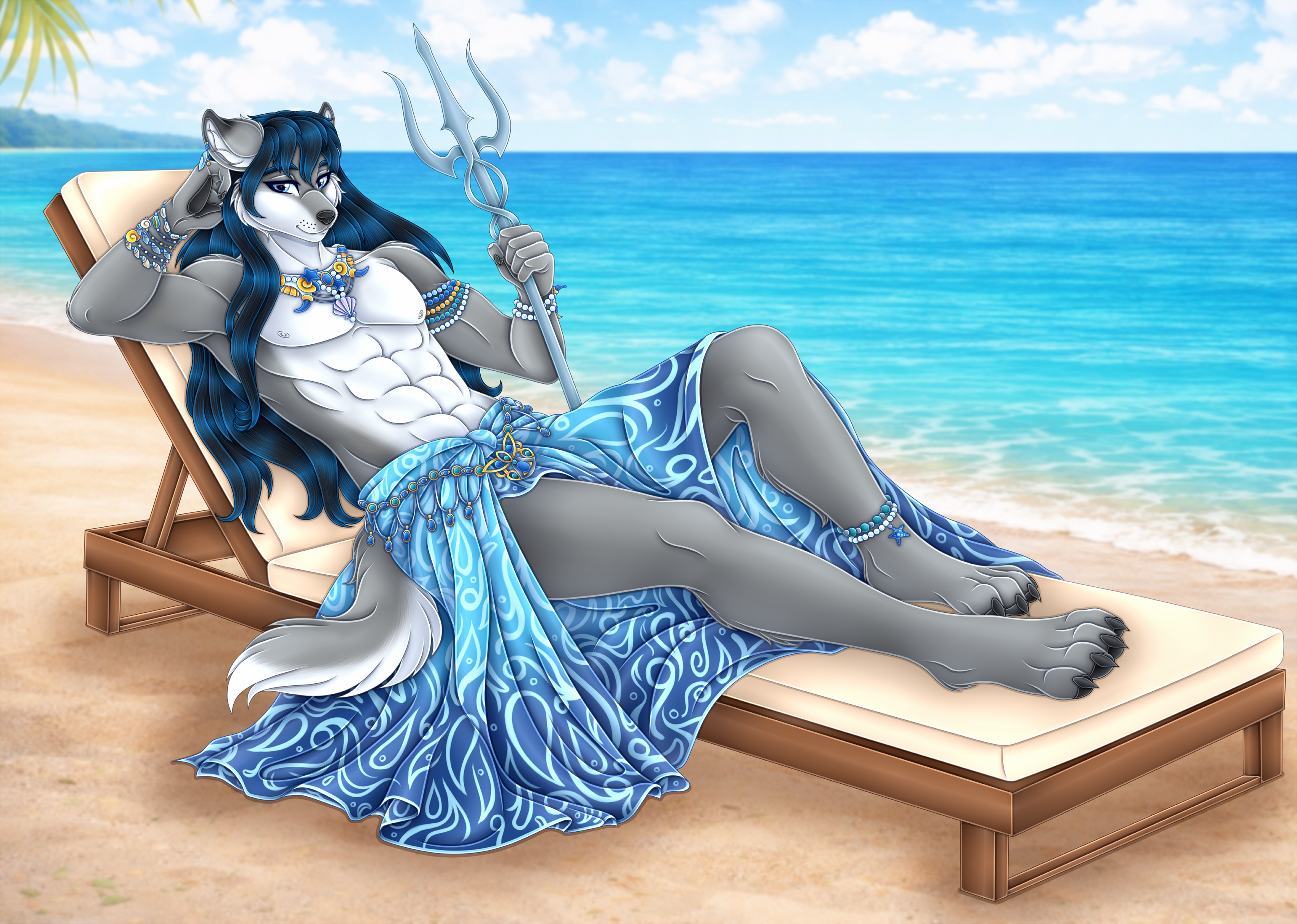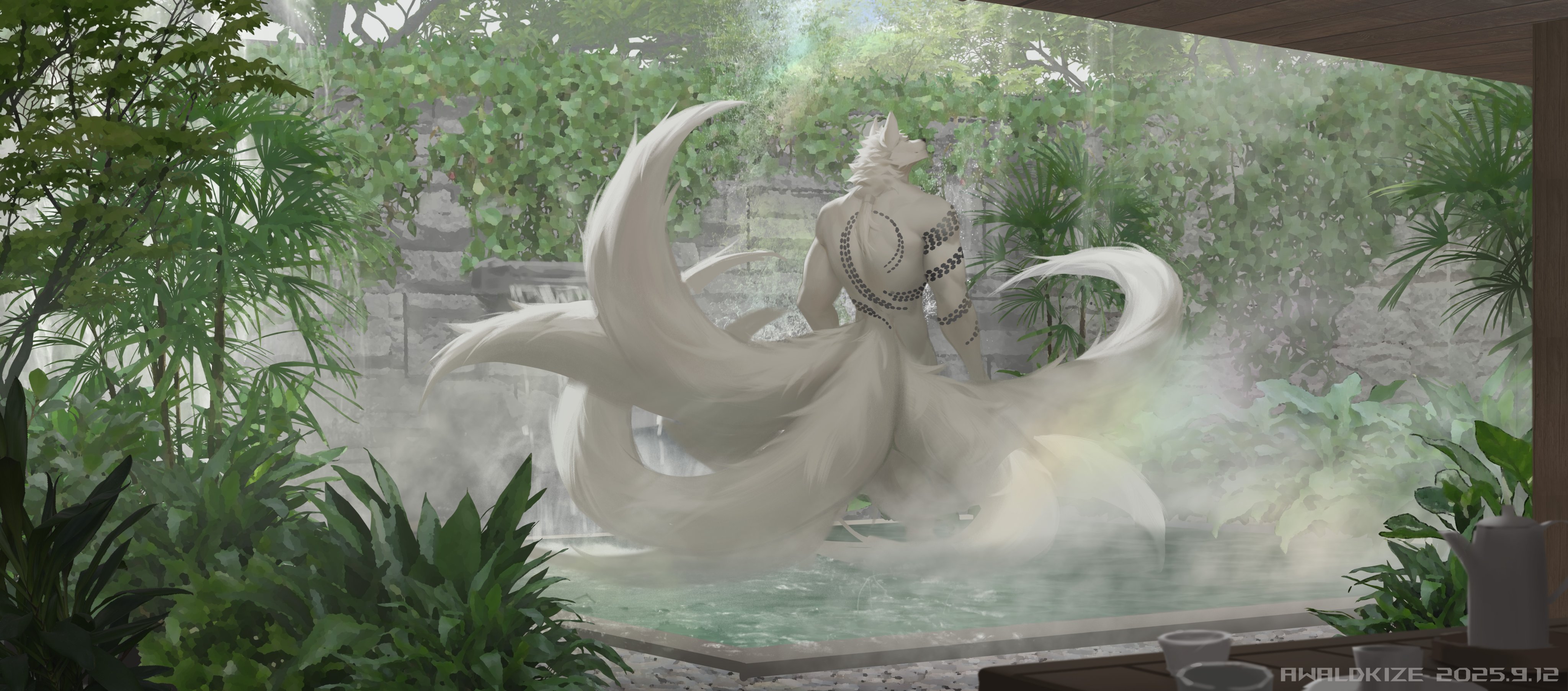 awaldkize canid canine mammal anthro black_markings black_nose cheek_tuft eyes_closed facial_tuft fur male male_anthro markings mouth_closed multi_tail muscular muscular_anthro muscular_male neck_tuft nude outside plant rear_view solo standing tail text tuft water white_body white_fur white_tail 2025 absurd_res artist_name dated hi_res rating:s
