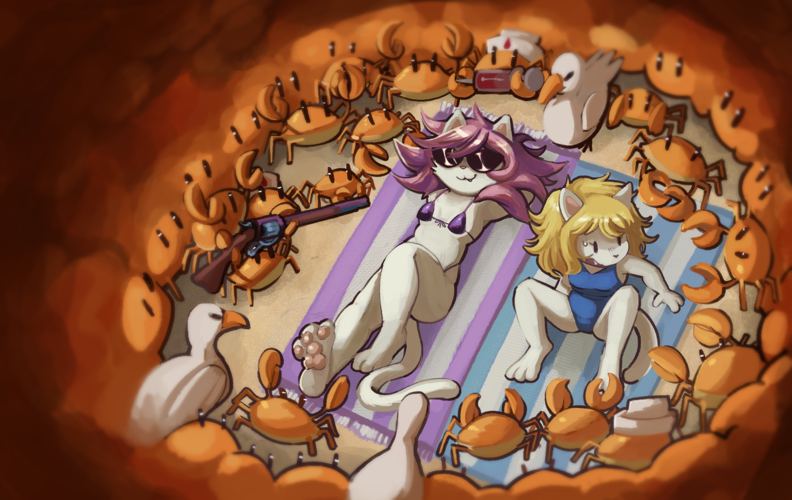 scrambledeve catlike_magic marni_(catlike_magic) perri_(catlike_magic) arthropod avian bird crab crustacean decapod domestic_cat felid feline felis gull lari larid malacostracan mammal anthro beach beach_blanket bikini bikini_bottom bikini_top blonde_hair bodily_fluids breasts clothed clothing duo eyewear female fur glasses gun hair headgear headwear lying on_back open_mouth outside pawpads paws pink_hair ranged_weapon sand smile sunglasses surprised sweat swimwear tail two-piece_swimsuit weapon white_body white_fur worried hi_res rating:s