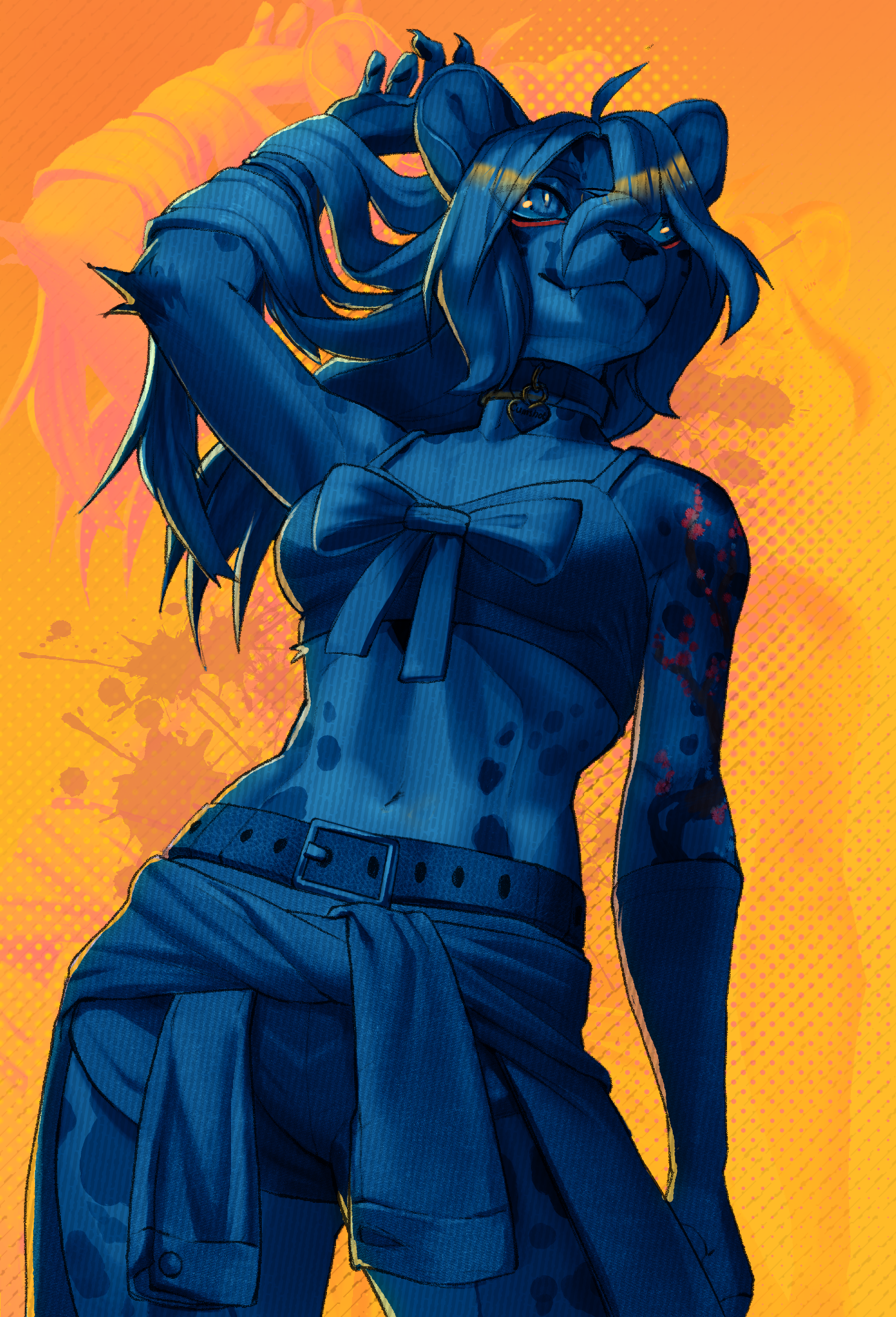 red_rooster dina_(yebjiwara) cheetah felid feline king_cheetah mammal 5_fingers abstract_background accessory anthro arm_tattoo arm_tuft armwear athletic athletic_female bare_shoulders belt belt_buckle biped blue_body blue_hair bottomwear bow_ribbon bra breasts buckle claws clothed clothed_anthro clothed_female clothing collar collar_tag crop_top elbow_gloves elbow_tuft eyebrows eyelashes fangs female female_anthro finger_claws fingers front_view fully_clothed fully_clothed_anthro fully_clothed_female fur glistening glistening_eyes gloves hair hair_over_eye hand_behind_head handwear hotpants inner_ear_fluff long_hair looking_aside looking_at_viewer low-angle_view markings messy_hair midriff navel orange_background pants pattern_background pose pupils raised_arm ribbons shirt shorts simple_background slim slit_pupils smile smirk solo sports_bra spots spotted_body spotted_fur standing tattoo teeth topwear touching_hair translucent translucent_hair tuft underwear yellow_background digital_drawing_(artwork) digital_media_(artwork) hi_res portrait restricted_palette shaded sketch three-quarter_portrait rating:s