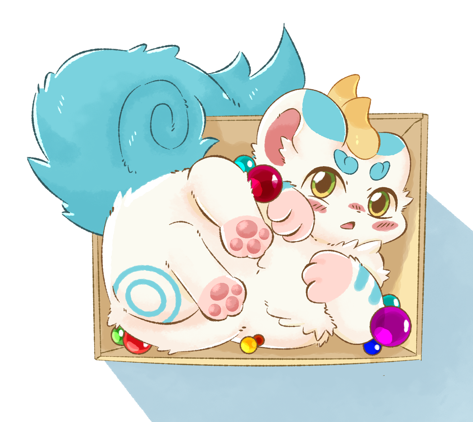 gaogomon fabulous_beasts mythology tianlu_(fabulous_beasts) mythological_creature pixiu 2_horns 3_fingers 3_toes ambiguous_gender arm_markings big_tail black_nose blue_eyes blue_markings blue_tail blush blush_lines box container feet feral fingers fluffy fur fur_markings glistening glistening_eyes green_eyes horn inner_ear_fluff kemono looking_at_viewer markings open_mouth pawpads pink_inner_ear pink_pawpads simple_background solo tail toes tuft white_background yellow_eyes yellow_horn hi_res rating:s