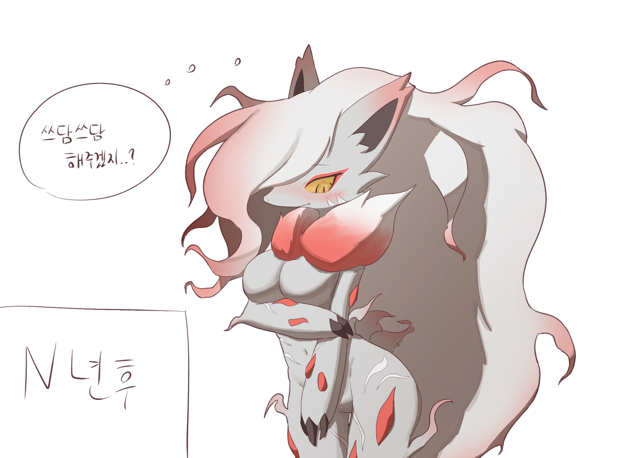 rokroc205 nintendo pokemon generation_8_pokemon hisuian_form hisuian_zoroark pokemon_(species) regional_form_(pokemon) anthro blush blush_lines breasts claws dipstick_ears ear_markings featureless_breasts female fur grey_body grey_ears grey_fur grey_hair hair multicolored_ears navel neck_tuft nude_anthro red_body red_ear_tips red_fur simple_background solo text tuft white_background yellow_eyes 2025 hi_res korean_text rating:s