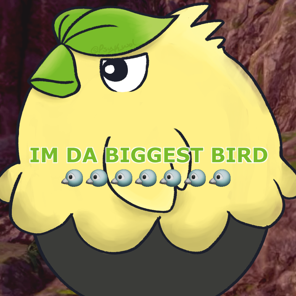 psykwol nintendo pokemon browt generation_10_pokemon pokemon_(species) ambiguous_gender black_body emoji feathers green_body leaf leaf_on_head photo_background side_view solo text yellow_body meme photography_(artwork) rating:s