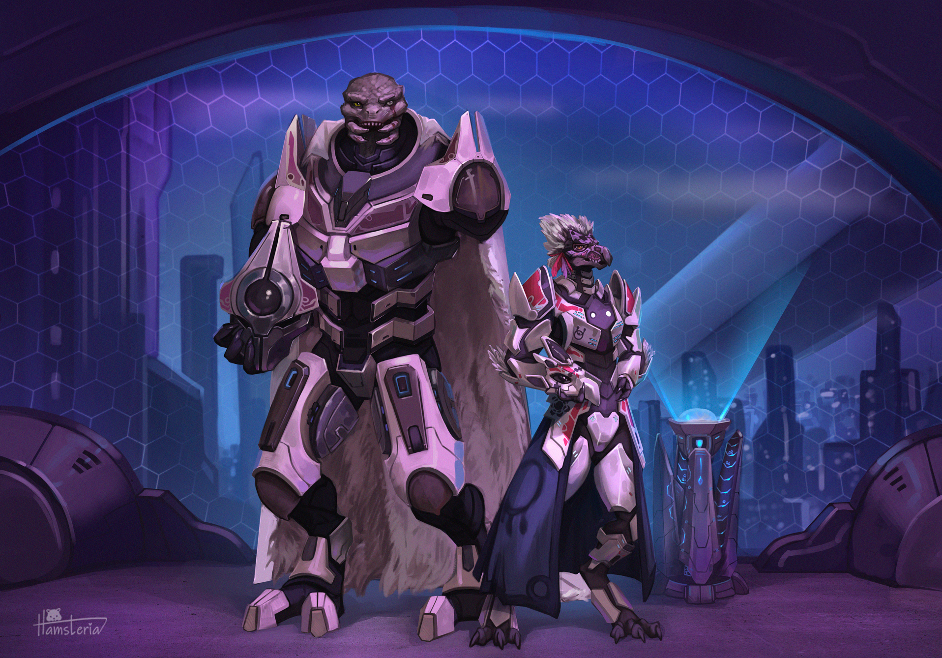 hamsteria halo_(series) microsoft xbox_game_studios alien avian kig-yar sangheili scalie t'vaoan 2_toes 3_toes amputee anthro arm_feathers arm_tuft armor beak cape city city_background clothing disability duo facial_scar feather_hair feathered_crest feathers feet female full_armor green_eyes hand_on_hip head_crest headgear helmet holding_armor holding_headgear holding_helmet holding_object larger_male male mandibles missing_arm orange_eyes pseudo_hair scar sharp_teeth size_difference smaller_anthro smaller_female standing teeth toes tuft white_body white_feathers colored hi_res rating:s