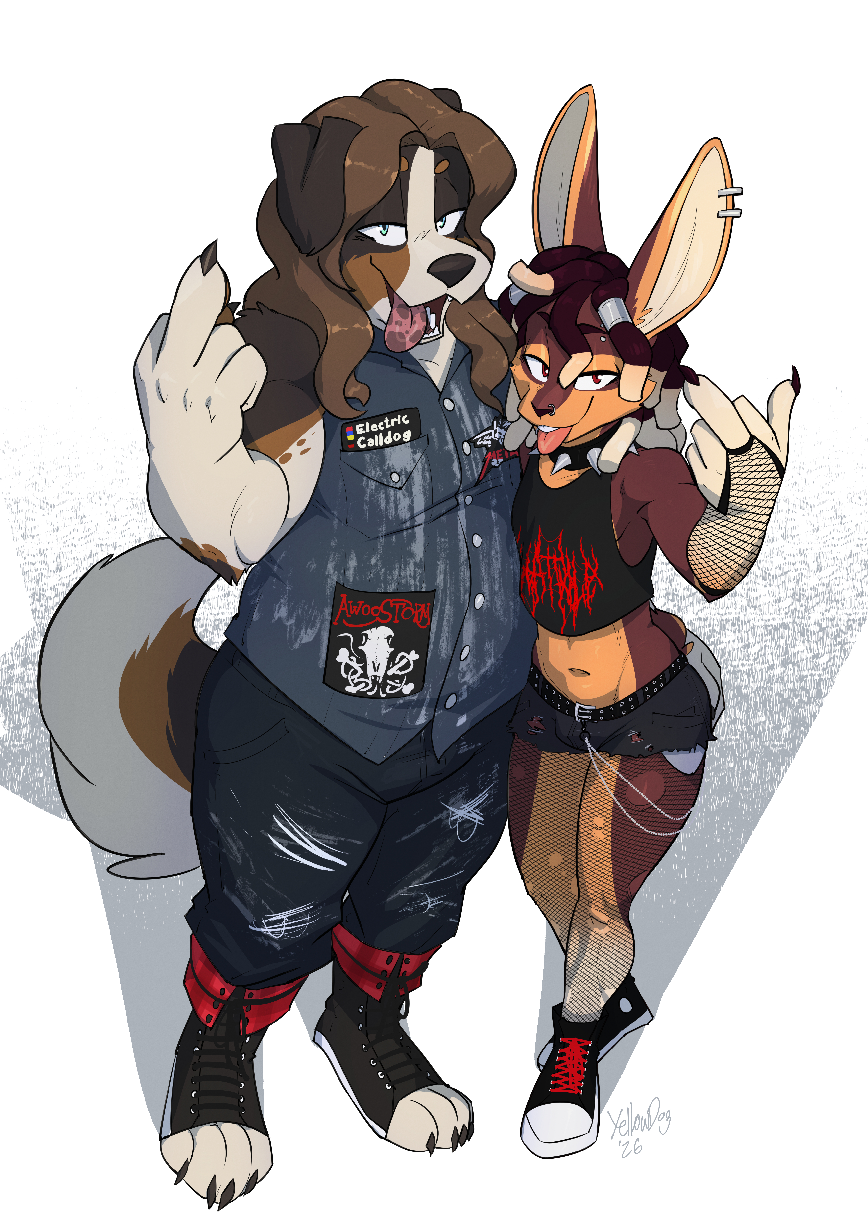 yellowdog alestorm electric_callboy metallica darragh_(setthemood) canid canine canis domestic_dog domestic_rabbit lagomorph leporid mammal oryctolagus rabbit tan_rabbit anthro armwear battle_jacket belt biped black_body black_fur bottomwear brown_body brown_fur buckteeth clothing collar denim denim_clothing denim_topwear denim_vest dreadlocks duo femboy fishnet_armwear fishnet_bridal_gauntlets fishnet_clothing fishnet_leggings fishnet_legwear flipping_viewer_off footwear fur furgonomic_footwear furgonomics gesture hand_gesture leggings legwear looking_at_viewer male middle_finger multicolored_body multicolored_fur orange_body orange_fur pants red_eyes shorts spiked_collar spikes standing teeth text tongue tongue_out topwear torn_clothing torn_leggings torn_legwear vest white_body white_fur 2026 absurd_res digital_media_(artwork) english_text hi_res rating:s