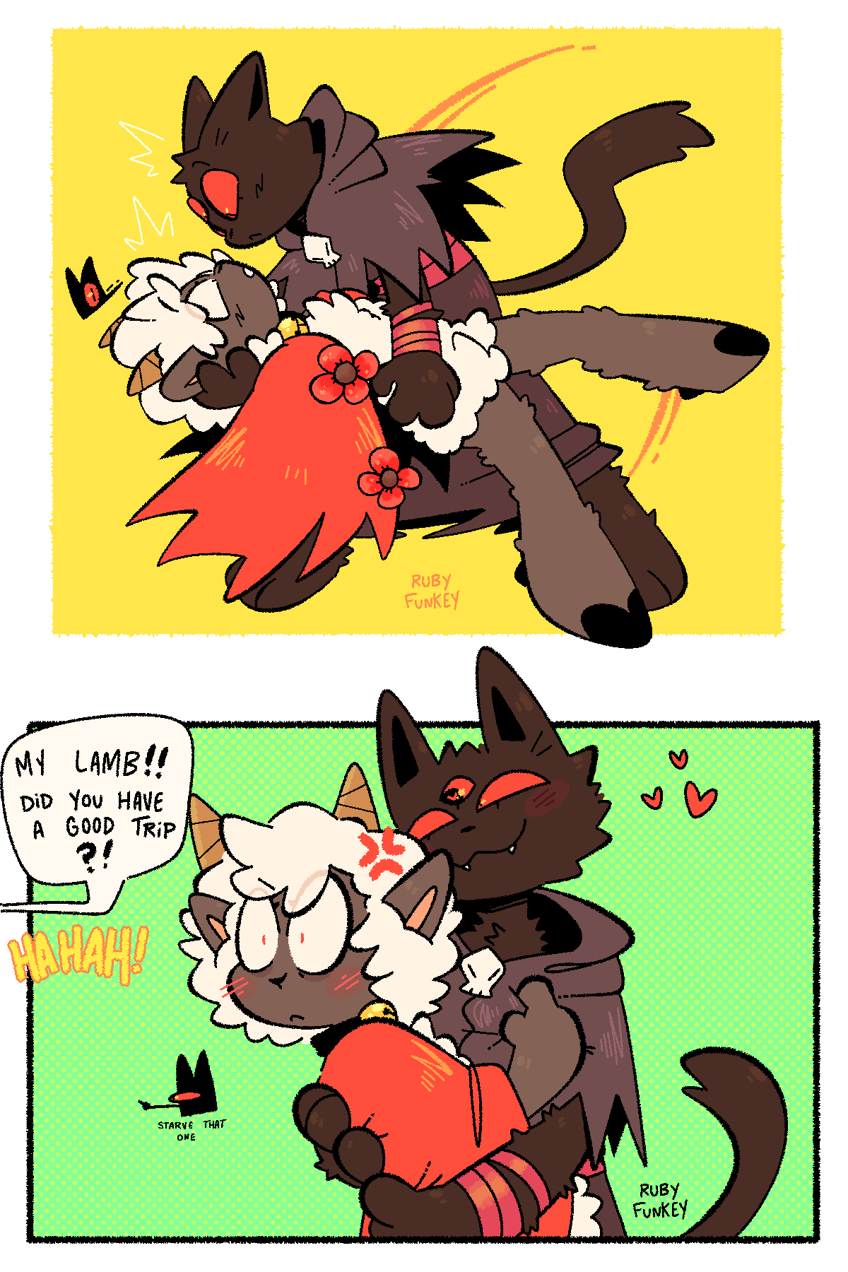 rubyfunkey cult_of_the_lamb massive_monster_(studio) lamb_(cult_of_the_lamb) narinder bovid caprine domestic_cat felid feline felis mammal sheep 2_horns 3_eyes ambiguous_anthro ambiguous_gender anthro black_body black_fur blush dialogue duo eye_contact flower fur green_background horn looking_at_another multi_eye plant red_eyes red_flower simple_background speech_bubble text white_body white_fur white_wool wool_(fur) yellow_background 2024 comic digital_drawing_(artwork) digital_media_(artwork) english_text hi_res rating:s