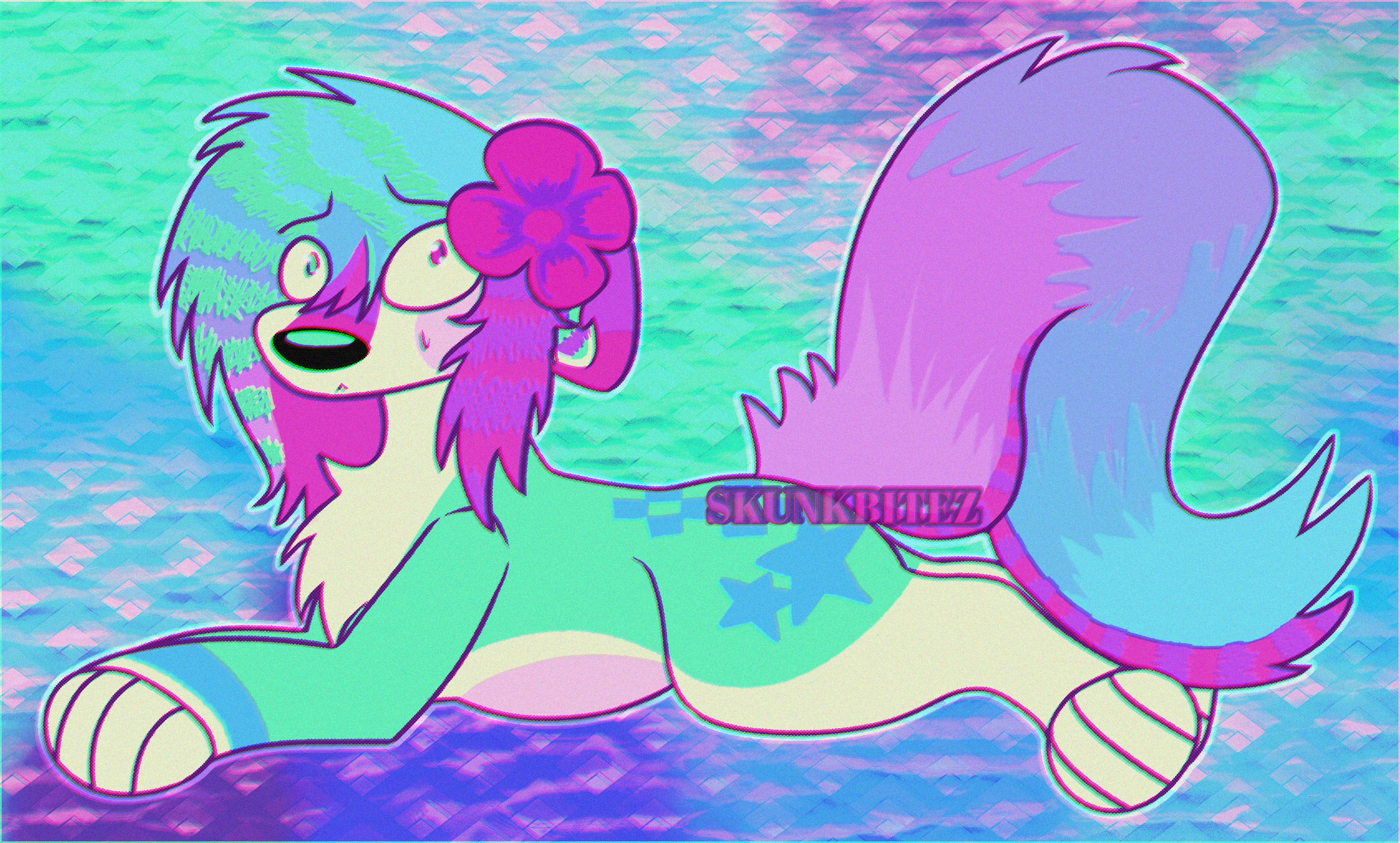 skunkbitez chlorine_(alienvuppy) canid canine canis domestic_dog mammal abstract_background accessory ambiguous_gender bodily_fluids countershade_face countershade_fur countershade_torso countershading feral flower flower_in_hair fur glistening glistening_eyes glistening_nose gradient_background gradient_hair gradient_tail hair hair_accessory lying on_front pattern_background paws plant simple_background solo sparklefur sweat 2026 chromatic_aberration hi_res rating:s