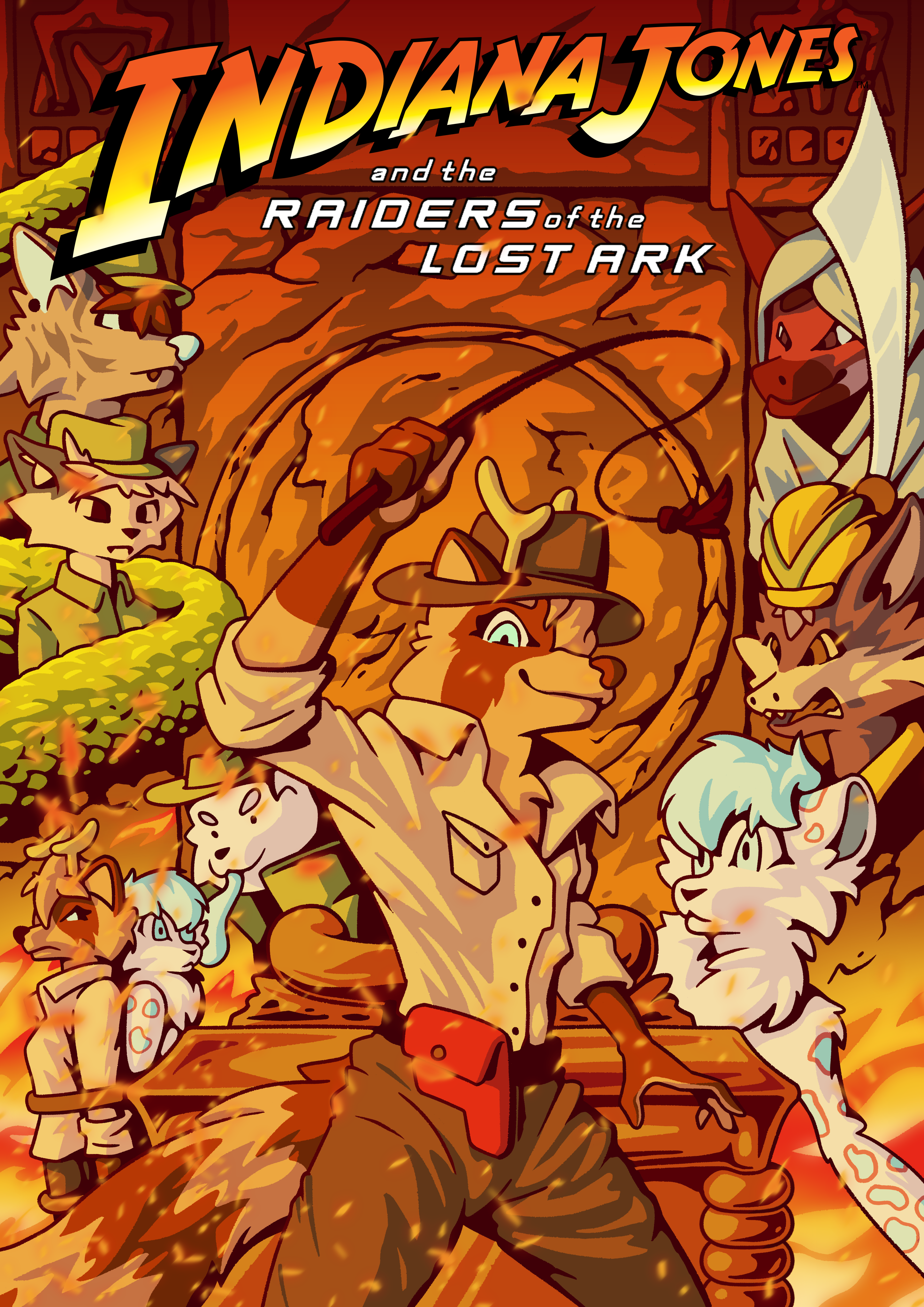 ink_snout indiana_jones_(franchise) canid canine cheetah deer domestic_cat felid feline felis fox human humanoid hyena mammal pantherine anthro female female_anthro fire group male melee_weapon movie_poster nude on_model poster scabbard sword weapon whip absurd_res hi_res rating:s