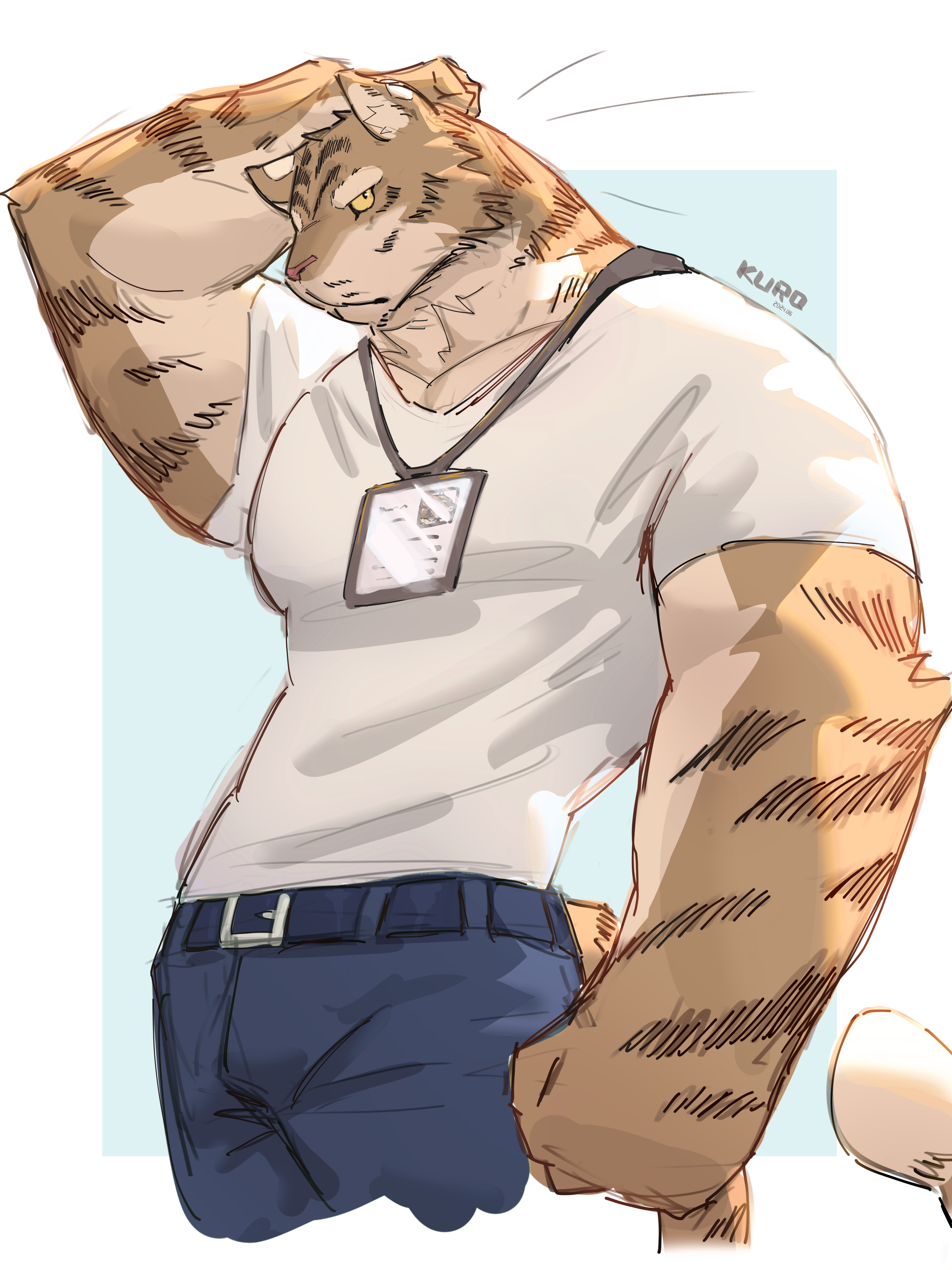 kuromonsart felid mammal pantherine tiger anthro belt_buckle big_muscles biped blue_background blue_bottomwear blue_clothing blue_pants bottomwear buckle clothed clothed_anthro clothed_male clothing countershade_arms countershade_face countershade_fur countershade_neck countershade_torso countershading eyebrows facial_markings fist front_view fully_clothed fully_clothed_anthro fully_clothed_male fur furrowed_eyebrows hand_behind_own_head head_markings huge_muscles inner_ear_fluff looking_at_viewer male markings monotone_bottomwear monotone_clothing monotone_pants monotone_shirt monotone_topwear mouth_closed multicolored_body multicolored_fur muscular muscular_male name_tag pants shirt simple_background snout solo striped_arms striped_face striped_markings striped_tail stripes tail tail_markings tan_body tan_countershading tan_eyebrows tan_inner_ear tan_inner_ear_fluff text topwear tuft two_tone_body two_tone_fur white_background white_clothing white_shirt white_topwear yellow_sclera 2024 3:4 absurd_res artist_name colored dated digital_drawing_(artwork) digital_media_(artwork) english_text hi_res portrait three-quarter_portrait rating:s