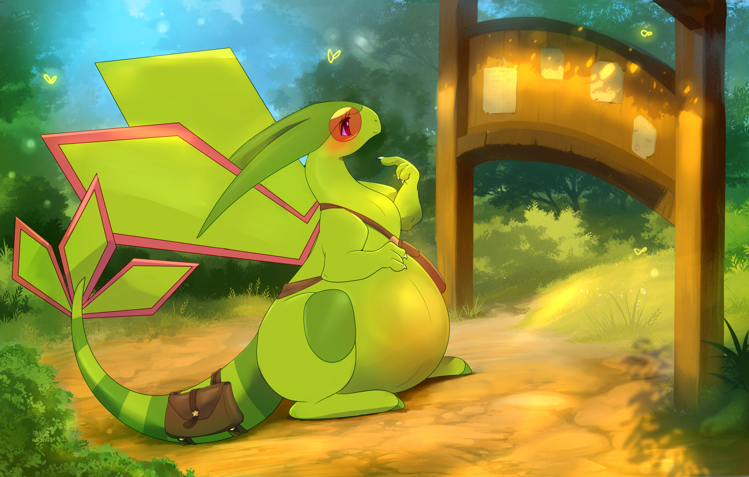 black_kitty nintendo pokemon pokemon_day pokemon_mystery_dungeon spike_chunsoft fan_character kamila_(mioulgaw) flygon generation_3_pokemon pokemon_(species) 4_fingers accessory anthro arms_bent bag belly belly_blush big_belly blush body_blush claws closed_smile content day dirt eyelashes female female_anthro finger_claws fingers furgonomics gesture grass green_body green_skin green_stripes green_tail hand_gesture heart_symbol light long_tail looking_at_sign markings mouth_closed multicolored_tail outside paper plant pointing pointing_at_self pregnant pregnant_anthro pregnant_female red_eyes semi-anthro shoulder_bag shrub sign sitting sitting_on_ground smile solo striped_markings striped_tail stripes tail tail_accessory tail_bag tail_markings text thick_thighs white_claws 2026 colored digital_drawing_(artwork) digital_media_(artwork) english_description english_text hi_res lighting shaded rating:s