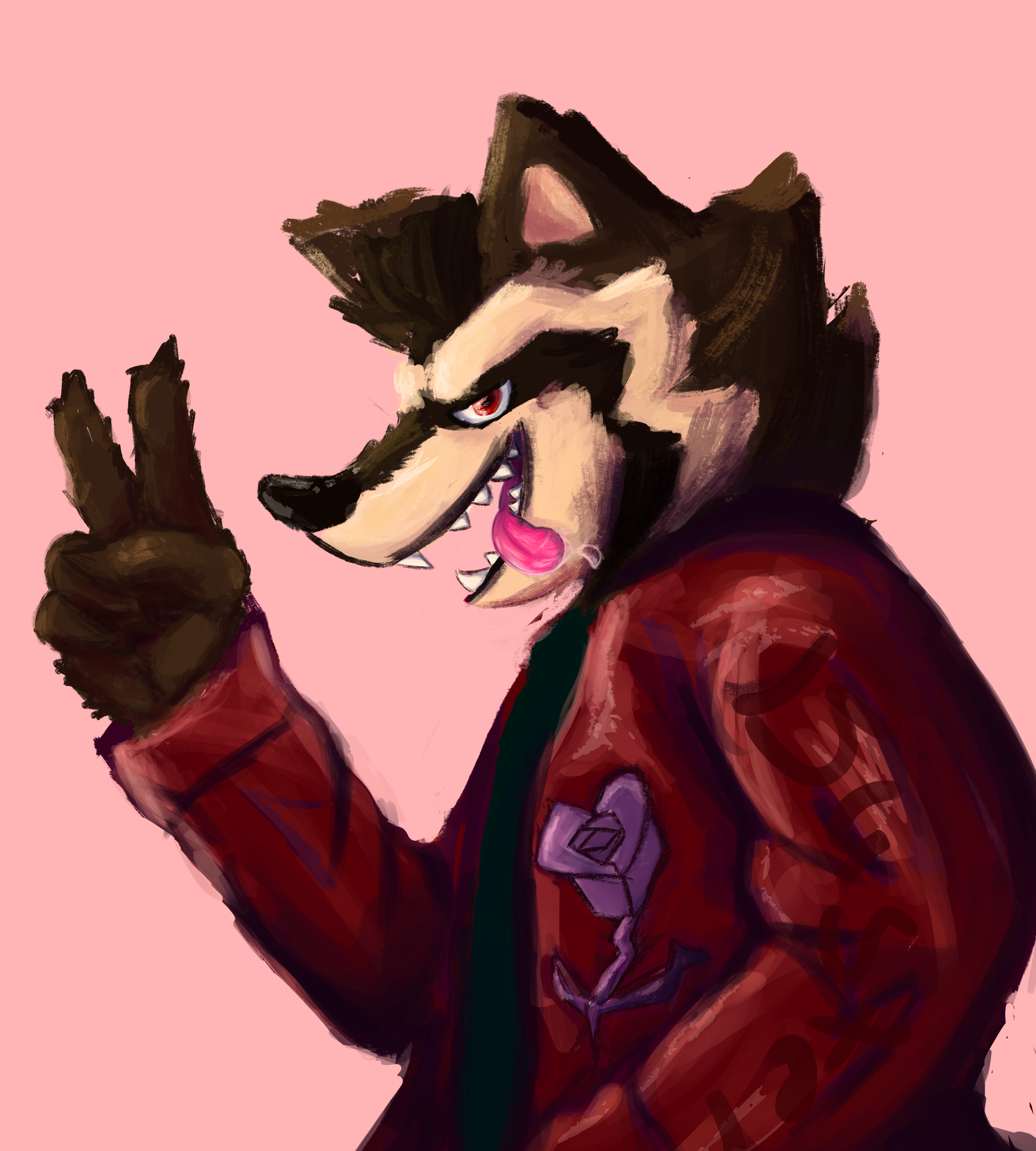 buster915 buster mammal procyonid raccoon anthro clothing flower gesture hand_gesture jacket male open_mouth pink_background plant red_clothing red_jacket red_topwear rose_(flower) simple_background smile solo tongue tongue_out topwear v_sign absurd_res hi_res rating:s