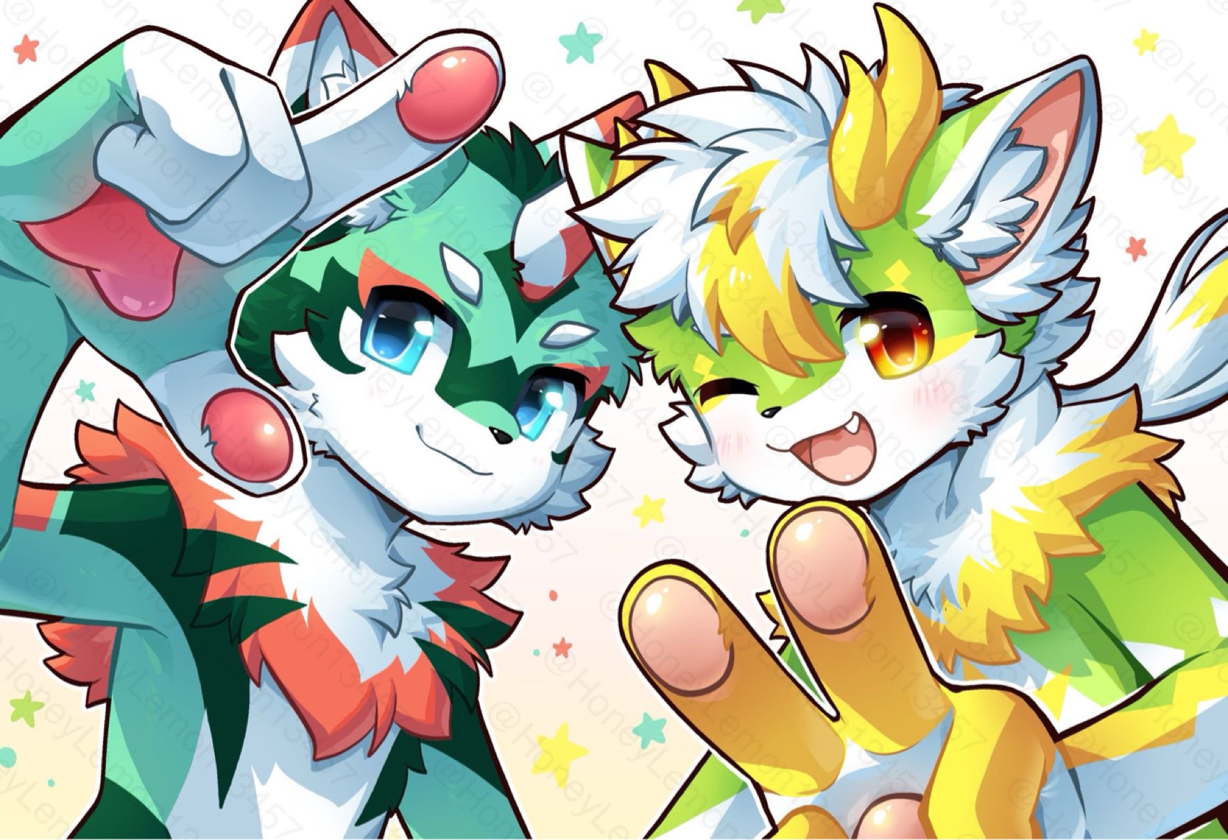 honeylemon13457 mythology honlem lai_ka aquatic dragon fish furred_dragon furred_fish furred_scalie mythological_creature mythological_scalie scalie 1_horn 2_horns 4_fingers anthro biped black_outline blue_eyes blush blush_lines chest_tuft cute_fangs dragon_horn duo fangs finger_gun fingers fur gesture glistening glistening_eyes green_body green_fur hair hand_gesture horn inner_ear_fluff looking_at_viewer male one_eye_closed open_mouth open_smile outline pattern_background pawpads simple_background smile smiling_at_viewer star-shaped_background teeth tuft v_sign white_background white_body white_fur wink winking_at_viewer yellow_body yellow_eyes yellow_fur 2025 cel_shading digital_drawing_(artwork) digital_media_(artwork) distracting_watermark hi_res shaded watermark rating:s