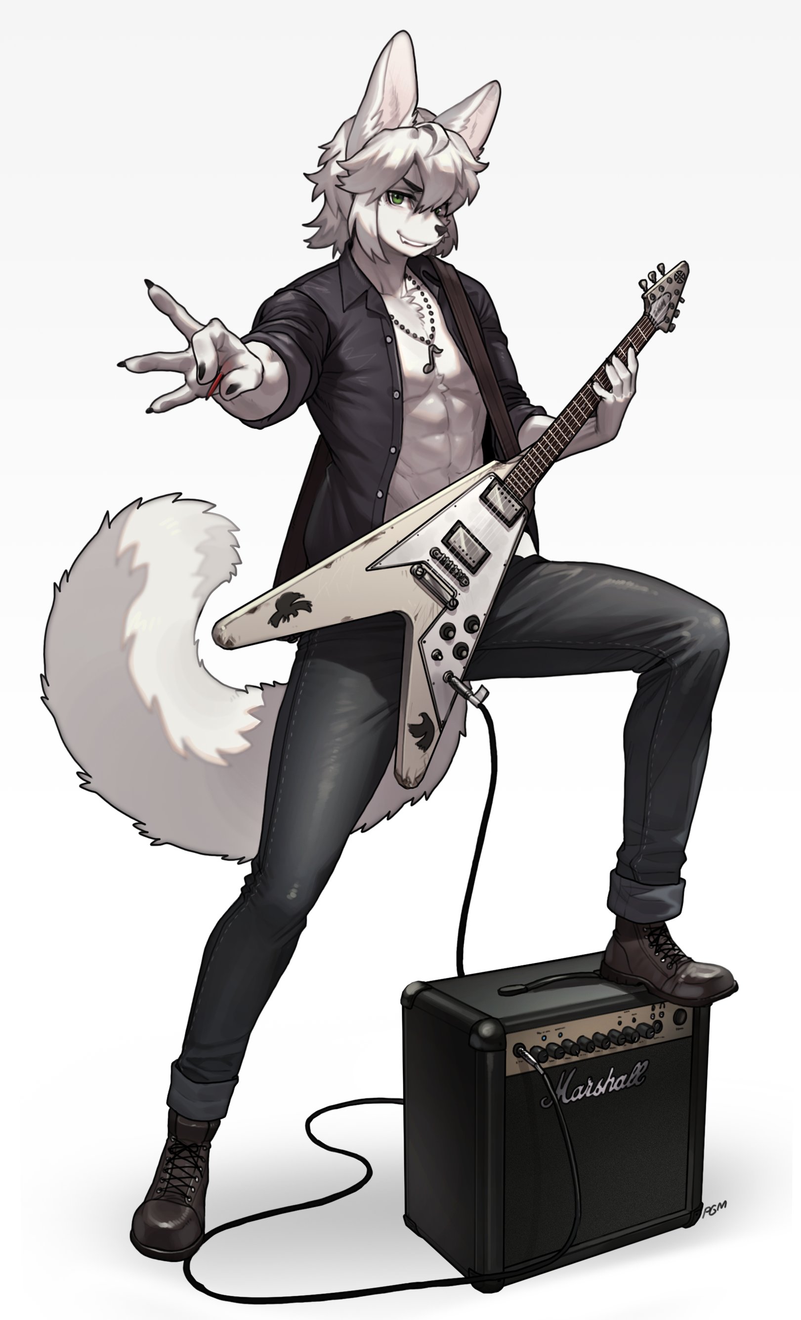 pgm300 canid canine mammal abs anthro biped bottomwear claws clothed clothed_anthro clothed_male clothing fingers footwear front_view fully_clothed fully_clothed_anthro fully_clothed_male fur guitar hair jewelry looking_at_viewer male musical_instrument necklace pants plucked_string_instrument shoes simple_background smile solo standing string_instrument tail teeth topwear 2026 absurd_res digital_drawing_(artwork) digital_media_(artwork) hi_res rating:s
