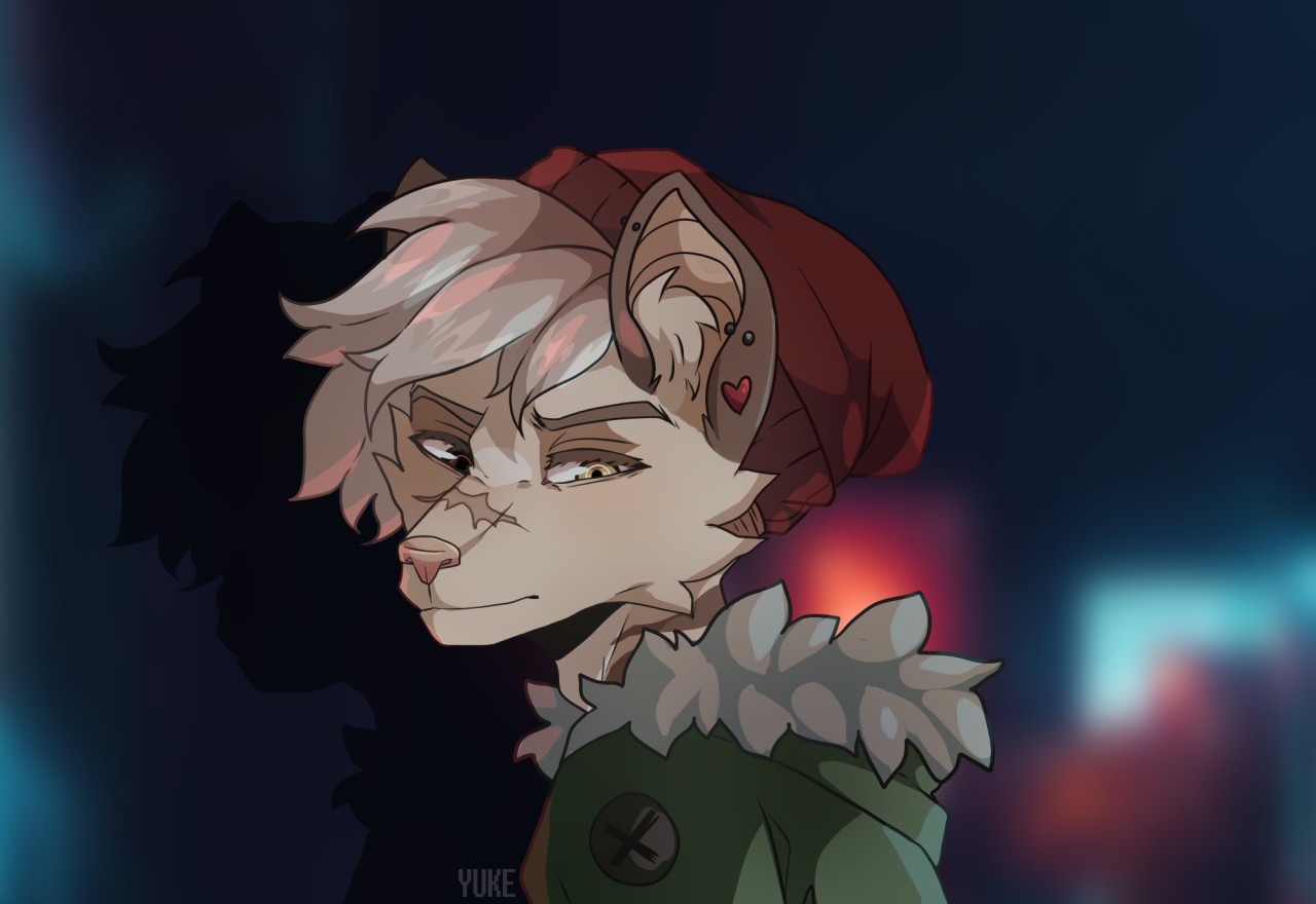 nickdrawing beastly_crimes beastly_crimes_(2024) badgercat domestic_cat felid feline felis mammal anthro black_nose clothing fur hoodie humanoid_hands male night outside smile solo standing topwear white_body white_fur 2026 3:4 rating:s