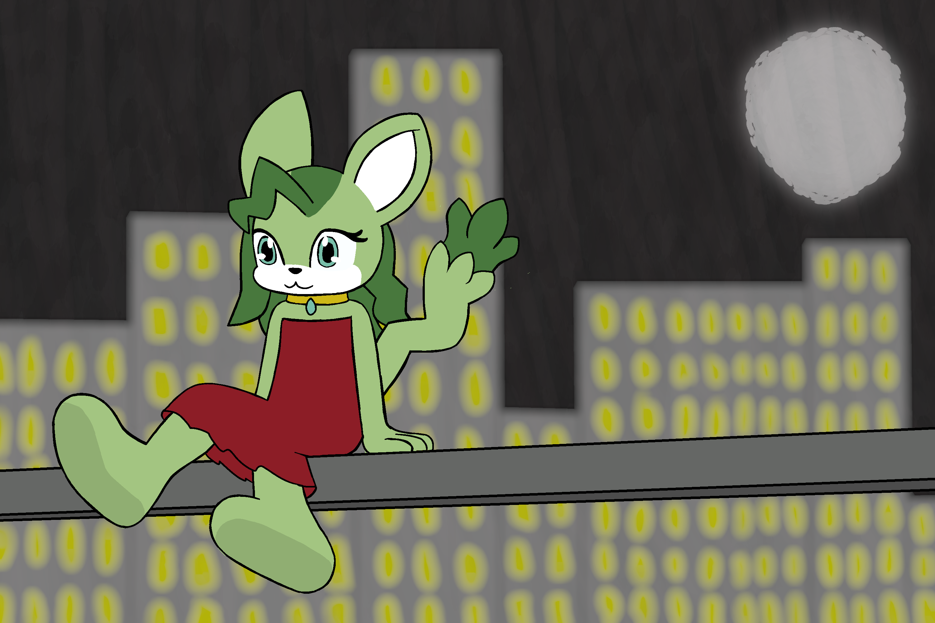 ticklebunny sega sonic_the_hedgehog_(series) megani_the_jackal canid canine canis jackal mammal anthro barefoot city city_background cityscape clothed clothing dress featureless_feet feet fully_clothed fur green_body green_fur green_hair hair jewelry necklace sitting smiley_face solo three-quarter_view 3:2 hi_res rating:s