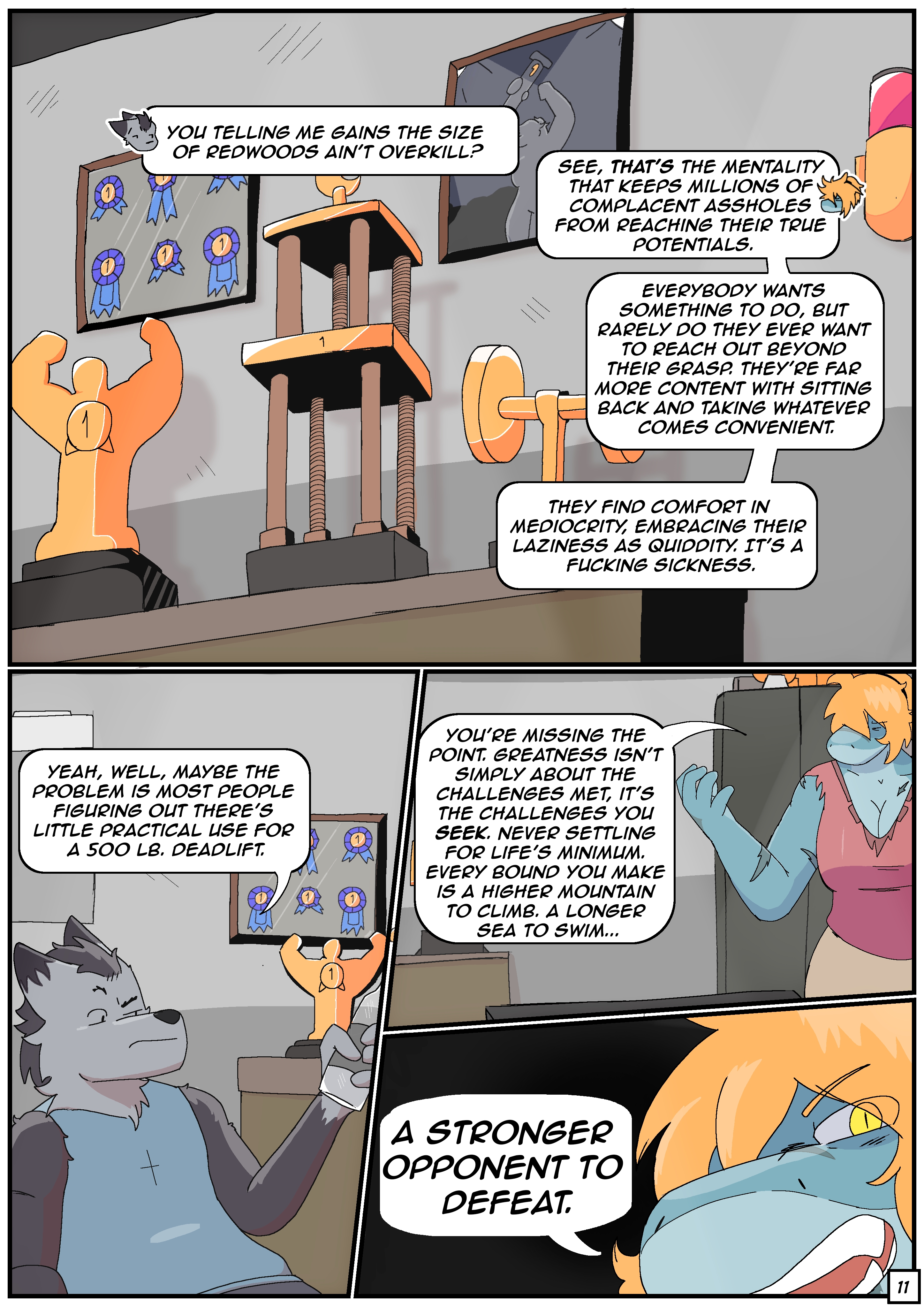 A note on alternate comic pages: Explicit public pages represent the artist’s original vision for the comic. Later in the development cycle, some patrons felt like knots served the doggos better, so Gaikotsu decided to put in some extra work as a little bonus. Canine genitalia alternate reality pages are available at the $11.50 tier as a bit of fanservice for ardent supporters of the comic. You’re getting exactly the same story at the same art resolution, so you’re not really missing out on that much!