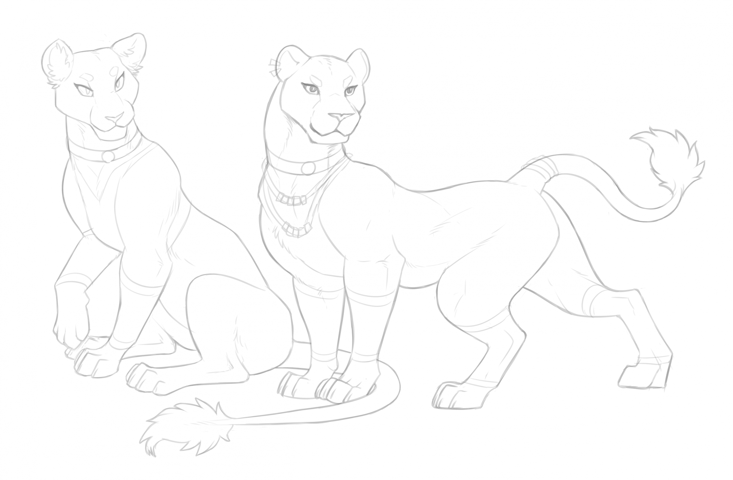 digitoxici felid lion mammal pantherine bracelet choker digitigrade duo ear_piercing female female_feral feral jewelry necklace piercing quadruped simple_background sitting tail tail_tuft tuft white_background 2026 digital_media_(artwork) hi_res line_art monochrome rating:s