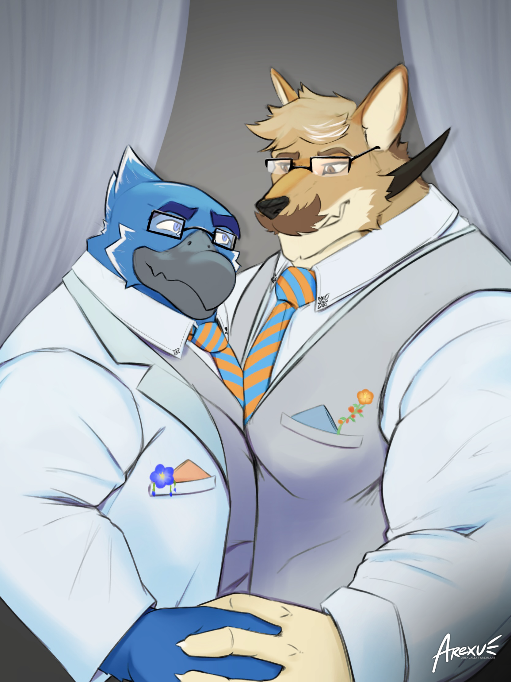arexualex alberto_(antifreeze) neptune_mereaux avian bird bluebird canid canine canis coyote eastern_bluebird mammal oscine passerine thrush_(bird) clothing eyewear facial_hair glasses love male male/male married_couple mature_male mustache necktie pocket_square suit wedding_clothing wedding_photography white_clothing white_suit white_tuxedo hi_res rating:s