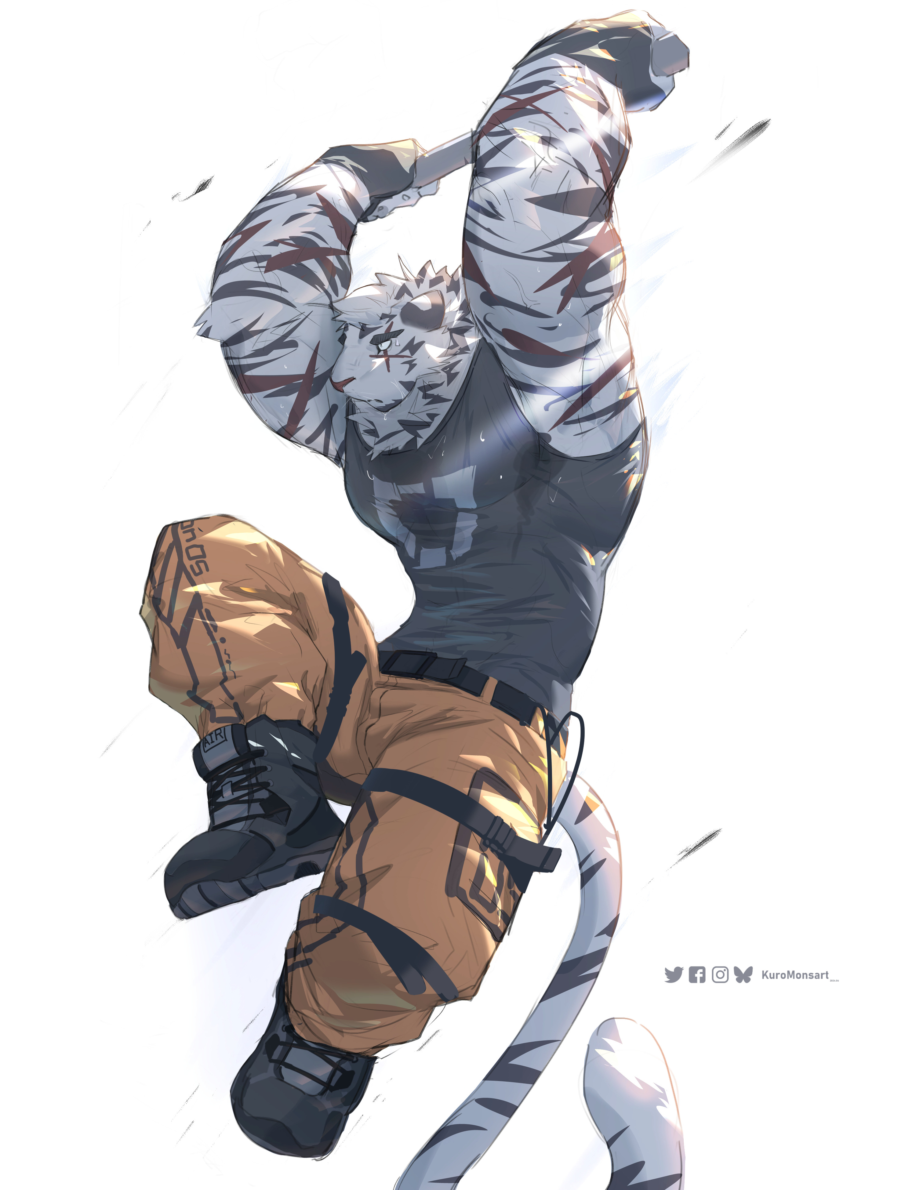 kuromonsart bluesky_(social_media) facebook instagram twitter felid mammal anthro big_muscles biped black_clothing black_footwear black_shirt black_shoes black_stripes black_tank_top black_topwear bluesky_logo bodily_fluids bottomwear brown_bottomwear brown_clothing brown_pants claws clothed clothed_anthro clothed_male clothing dot_pupils exercise facebook_logo finger_claws fingerless_gloves footwear front_view fully_clothed fully_clothed_anthro fully_clothed_male fur furrowed_eyebrows gloves grey_body grey_clothing grey_fur grey_hair grey_shirt grey_tank_top grey_topwear hair handwear holding_object huge_muscles instagram_logo leg_strap looking_aside male markings monotone_bottomwear monotone_clothing monotone_pants mouth_closed multicolored_bottomwear multicolored_clothing multicolored_shirt multicolored_topwear muscular muscular_anthro muscular_male orange_bottomwear orange_clothing orange_pants pants plantigrade pull-up_(exercise) raised_arms red_stripes shirt shoes simple_background snout solo striped_arms striped_markings striped_tail stripes sweat sweatdrop sweaty_armpit sweaty_arms sweaty_chest sweaty_face tail tail_markings tank_top text thigh_strap tight_tank_top topwear twitter_logo two_tone_bottomwear two_tone_clothing two_tone_pants two_tone_shirt two_tone_topwear whiskers white_background white_sclera 2024 absurd_res artist_name colored dated digital_drawing_(artwork) digital_media_(artwork) english_text full-length_portrait hi_res portrait rating:s