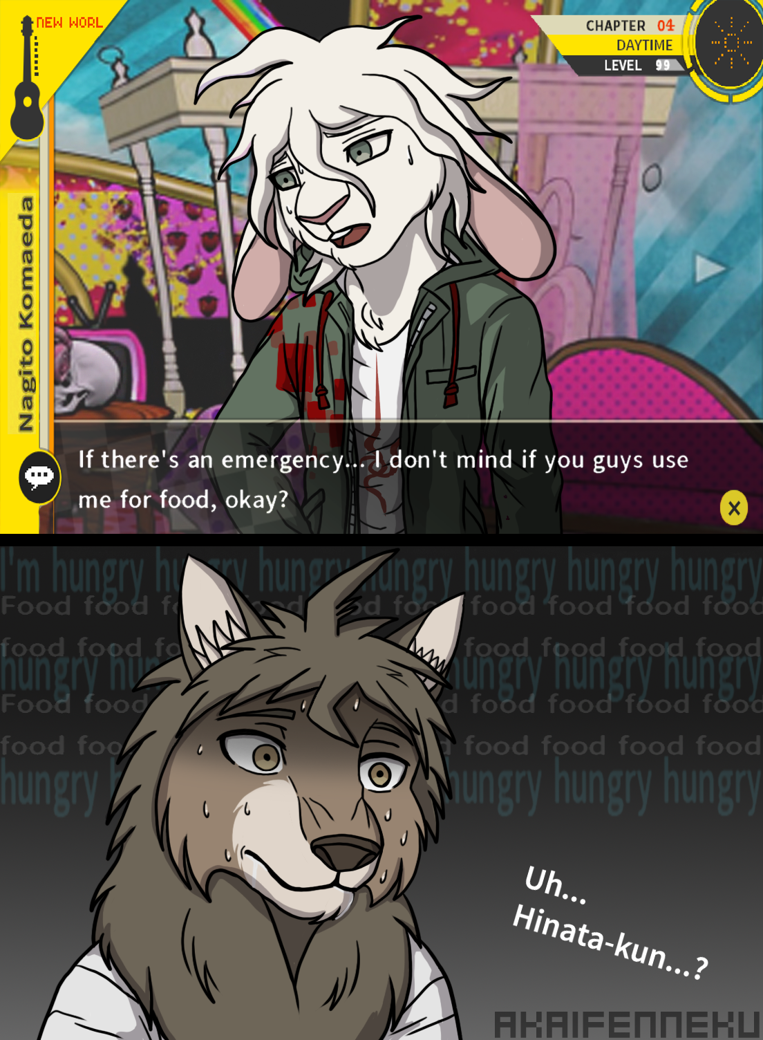 akaifenneku_(artist) beastars danganronpa danganronpa_2 disney spike_chunsoft zootopia hajime_hinata nagito_komaeda canid canine canis lagomorph leporid mammal rabbit wolf alternate_species anthro bodily_fluids brown_body brown_fur brown_hair clothed clothing dialogue dialogue_box drooling duo fur hair hungry ingame_assets male male/male mane multicolored_body multicolored_fur name_drop name_in_dialogue predator/prey saliva sweat sweatdrop text thoughts white_body white_fur 2021 artist_name crossover english_text hi_res signature rating:s